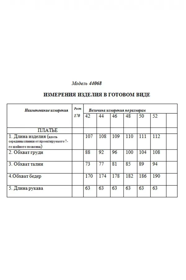 Платье, с центральной двубортной застежкой на петли и пуговицы, и потайную молнию в левом боковом шве, с отложным воротником- шаль. Верхняя часть переда с рельефами, выходящими из проймы. Верхняя часть спинки со средним швом и талиевыми вытачками .Нижняя часть переда и спинки расклешенная. Низ переда и низ спинки состоят из трех клиньев. Рукав втачной, длинный, с отрезной манжетой, застегивающейся на три петли и пуговицы. По окату и шву притачивания манжеты- сборка. Платье без подкладки.