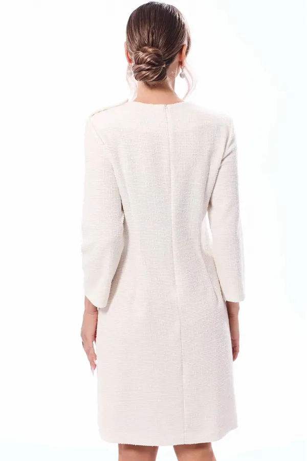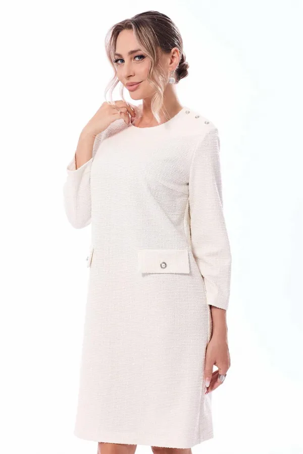 Платье с застежкой на потайную молнию в среднем шве спинки, без воротника, с круглым вырезом горловины, и доплнительной застежкой на петли и пуговицы по левому плечевому шву. По переду с нагрудными вытачками. На уровне линии бедер расположены отделочные клапаны, зафиксированные к платью петлей и пуговицей. Спинка со средним швом, талиевыми вытачками. Рукав втачной, 3/4.