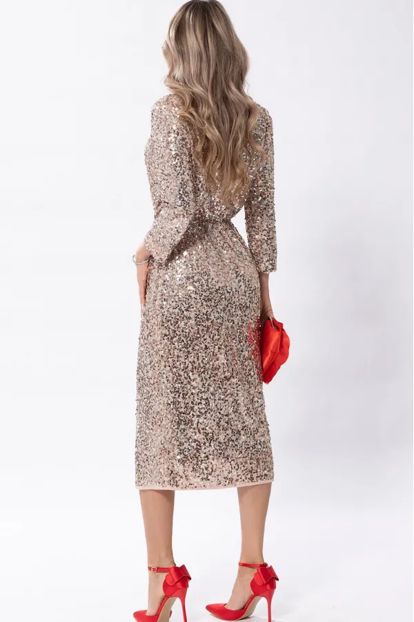Платье из ткани с пайетками полуприлегающего силуэта, без воротника с V-образным вырезом горловины, с полочками на запах, зафиксированными по линии талии и с застежкой на пришивную кнопку по горловине. Платье отрезное по линии талии По линии талии полочки присборены, также шов по талии присборен на резинку. Рукав втачной, 3/4.