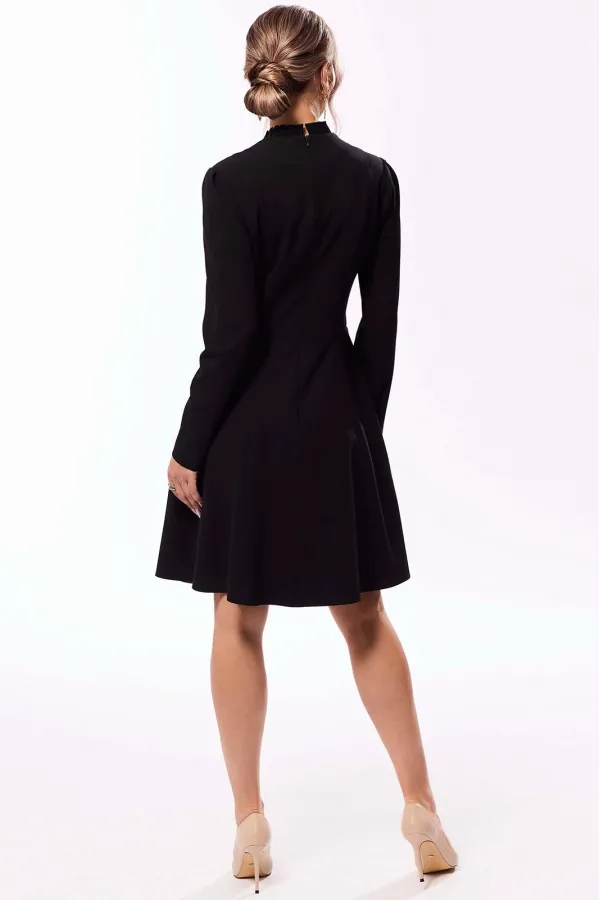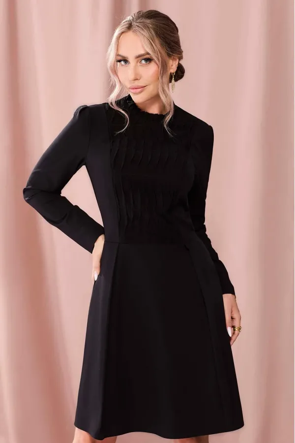 Платье полуприлегающего силуэта, с застежкой на потайную молнию в среднем шве спинки, с отрезным воротником- стойкой, заложенным в односторонние складки. Платье отрезное по линии талии. Верхняя часть переда с рельефами, выходящими из плеча. Центральная часть переда с декоративными защипами .Спинка со средним швом, рельефами, выходящими из плеча. Рукав втачной, длинный. Нижняя часть платья расширенная к низу.