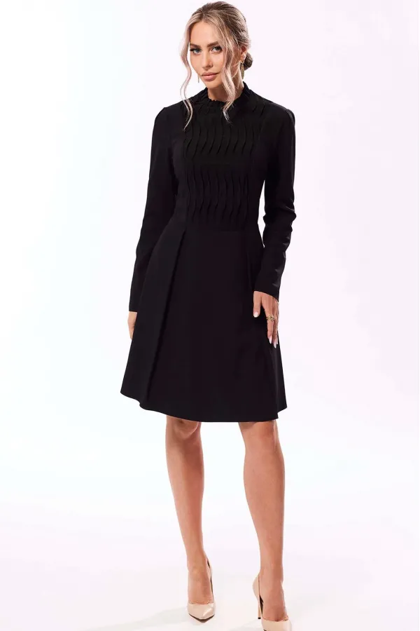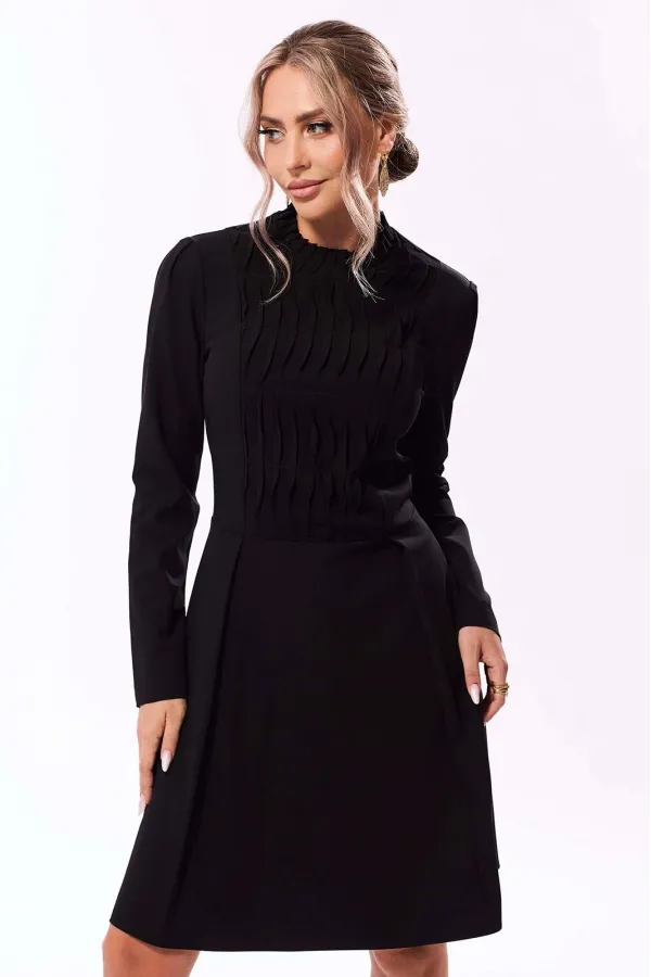 Платье полуприлегающего силуэта, с застежкой на потайную молнию в среднем шве спинки, с отрезным воротником- стойкой, заложенным в односторонние складки. Платье отрезное по линии талии. Верхняя часть переда с рельефами, ... Читать далее...