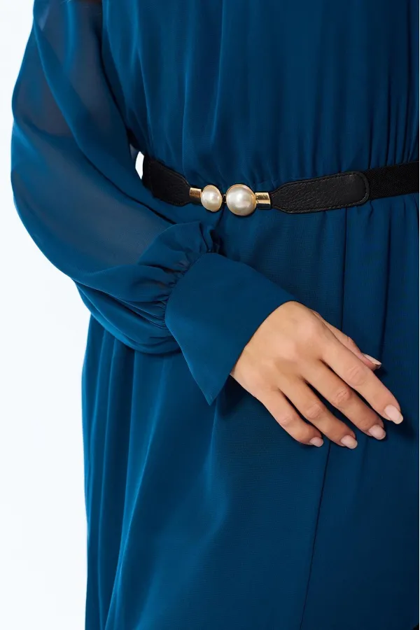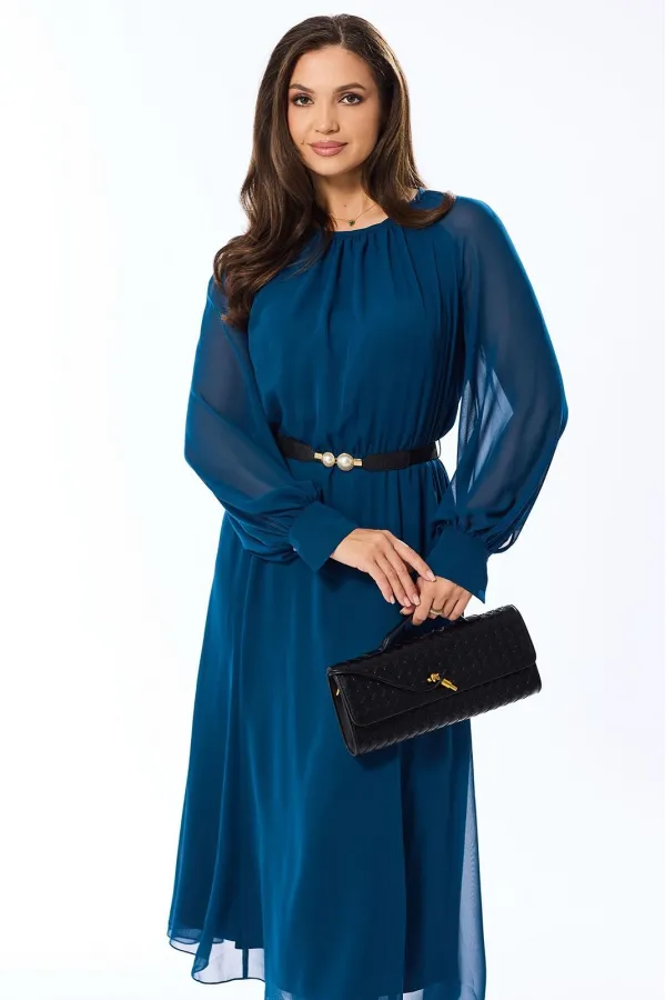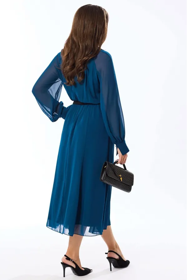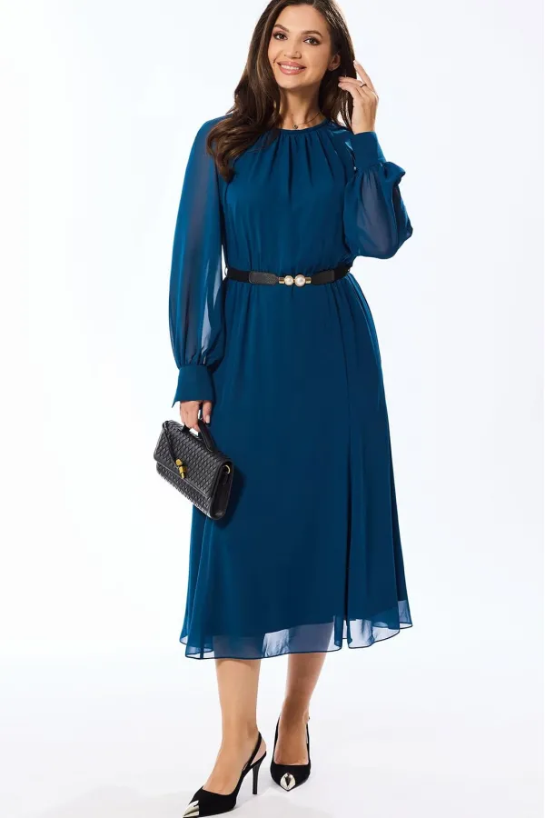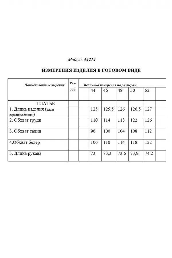 Платье без воротника, с круглым вырезом горловины, с застежкой на потайную молнию в среднем шве спинки. Платье, отрезное по линии талии, присборено на резинку. По лифу переда со сборкой по горловине. Спинка со средним швом. Нижняя часть платья расширена к низу по типу «годэ». Рукав реглан, длинный, с отрезной манжетой. Шов притачивания манжеты присборен.