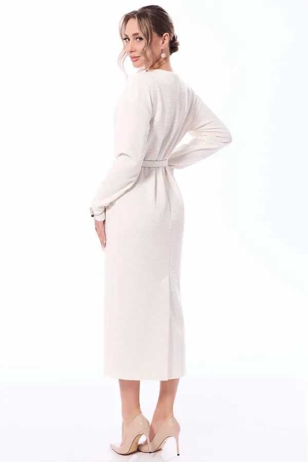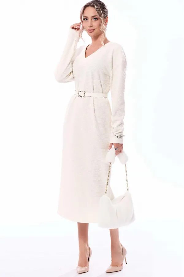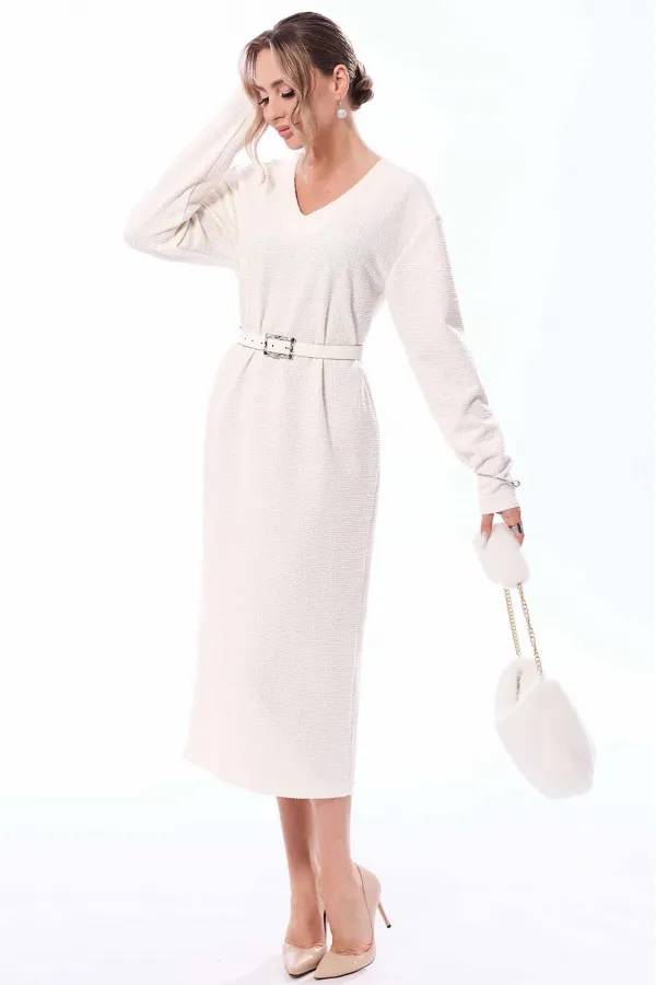 Платье без застежки, без воротника, с V-образным вырезом горловины. Перед цельный, спинка со средним швом, заканчивающимся шлицей. Рукав втачной, длинный. Платье со съемным поясом из кожезаменителя.