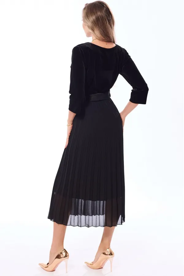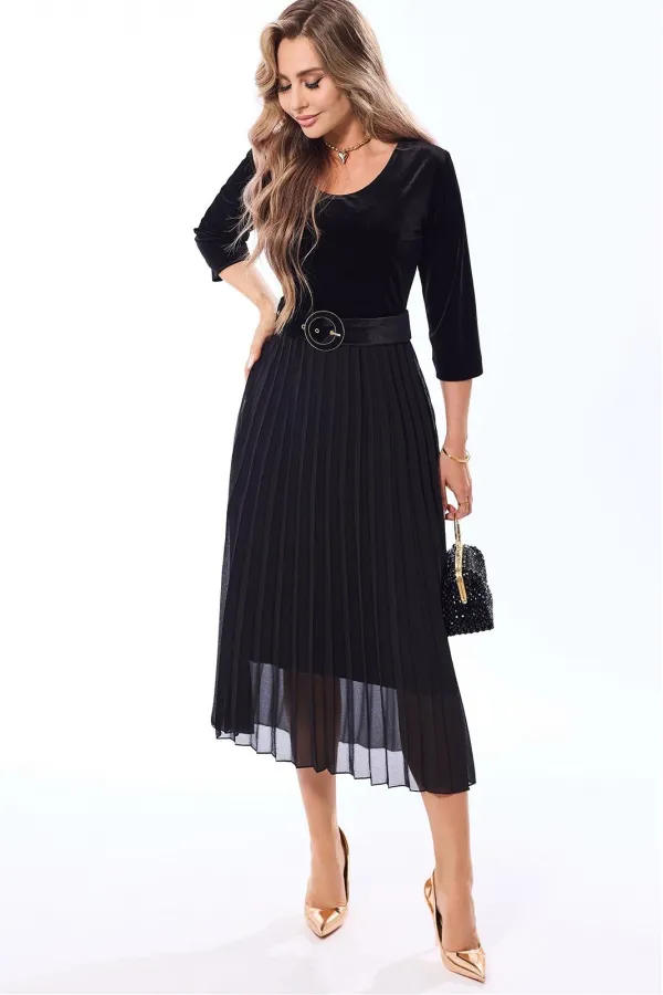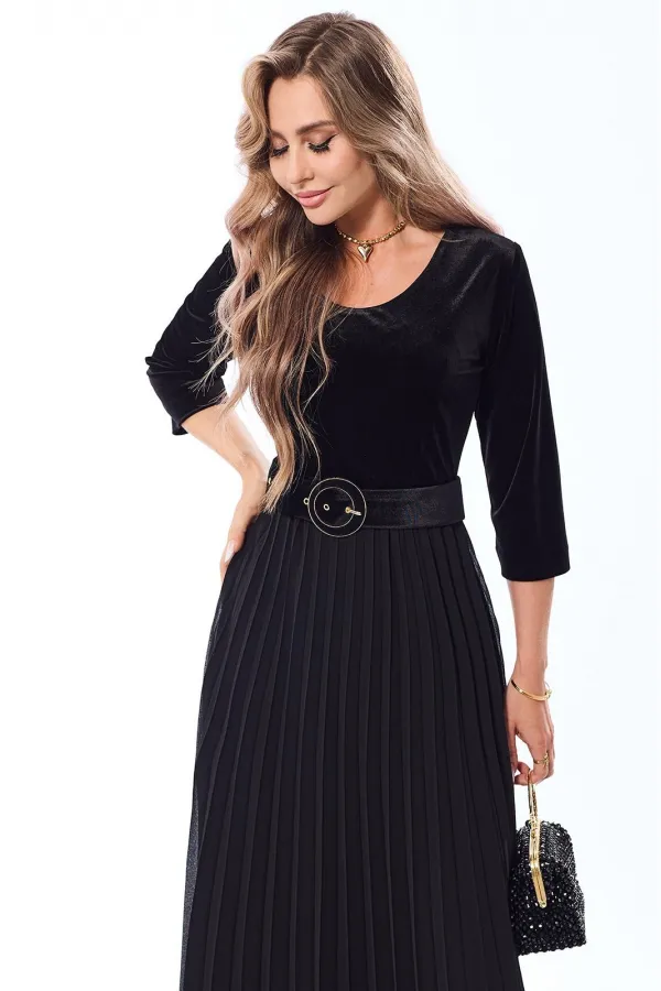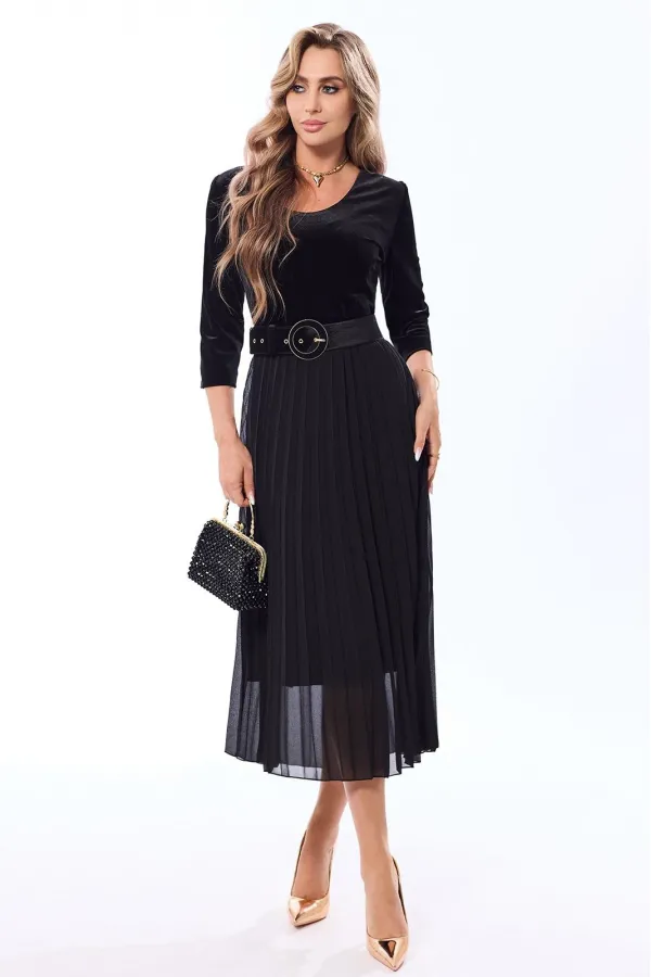 Платье полуприлегающего силуэта, с застежкой на потайную молнию в левом боковом шве, без воротника, с круглым вырезом горловины, отрезное по линии талии . Шов по талии присборен на резинку. Лиф переда с нагрудными и талиевыми вытачками. Спинка с талиевыми вытачками. Нижняя часть переда расклешенная к низу, с гофрировкой. Рукав втачной, длинный. Платье с декоративным поясом. По боковым швам расположены шлевки для пояса. Верхняя часть платья из бархата, нижняя часть- из шифона.