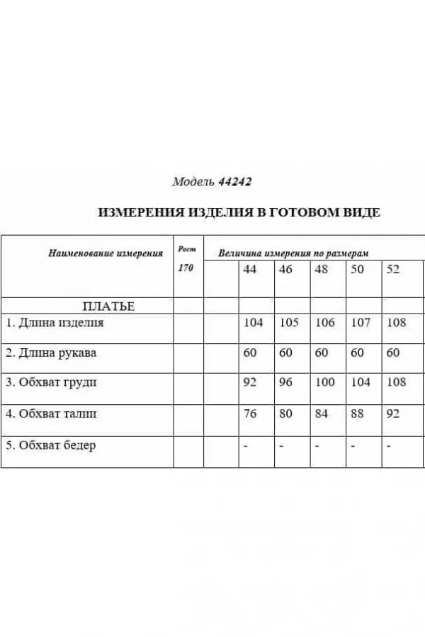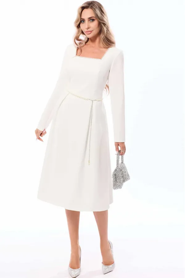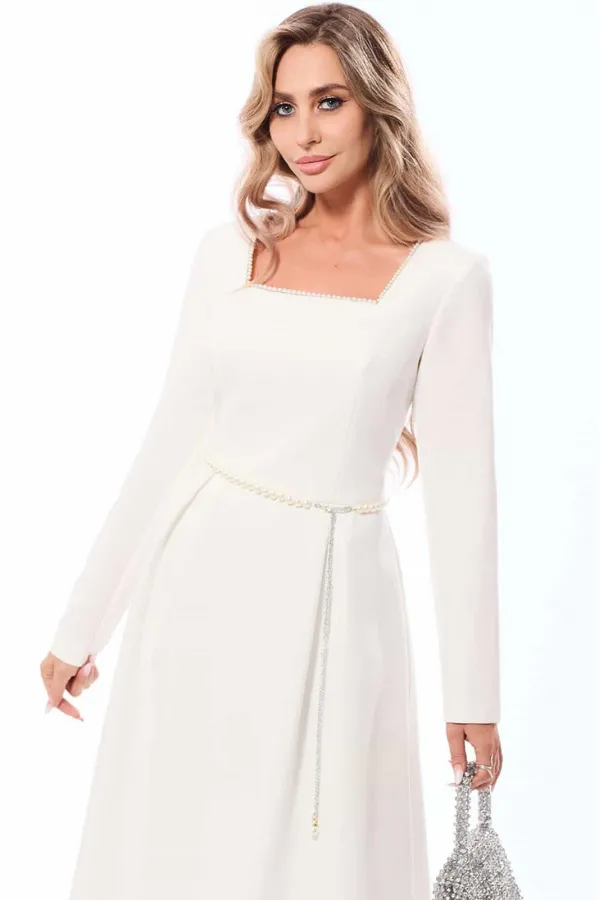 Платье полуприлегающего силуэта, с застежкой на потайную молнию в среднем шве спинки, без воротника, с квадратным вырезом горловины, отрезное по линии талии . Лиф переда с отрезной кокеткой, рельефами от кокеток до талии. Спинка со средним швом, талиевыми вытачками. Нижняя часть переда расклешенная к низу, с двумя встречными складками по переду и спинке. Рукав втачной, длинный. Платье с декоративным поясом. По боковым швам расположены шлевки для пояса. Горловина переда декорирована тесьмой с бусинами.