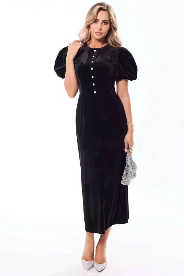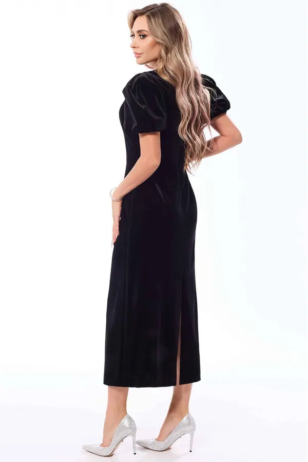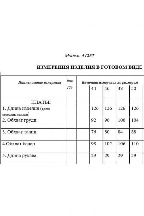 Платье без воротника, с круглым вырезом горловины, центральной застежкой на петли и пуговицы по лифу переда. Платье отрезное по линии талии. По лифу переда с нагрудными вытачками. Спинка со средним швом, заканчивающимся разрезом, талиевыми вытачками. Рукав втачной, короткий, по низу, присборен на резинку. Окат рукава присборен.