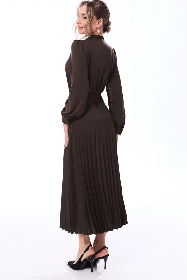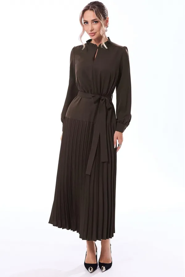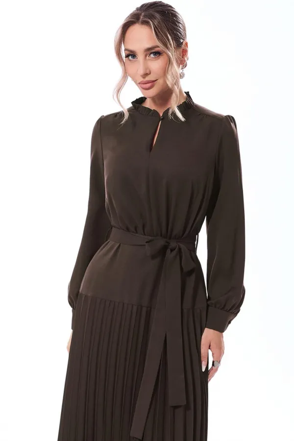 Платье с отрезным присборенным воротником- стойкой, горловина переда с разрезом, застегивающимся на одну навесную петлю и пуговицу. Платье отрезное по линии талии, шов по талии присборен. По низу платья- отрезная кокетка и деталь- гофре. Рукав втачной, длинный, с отрезной манжетой, застегивающейся на одну петлю и пуговицу. Платье со съемным поясом. На боковых швах расположены шлевки для пояса.