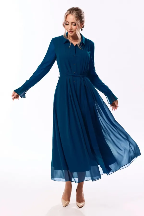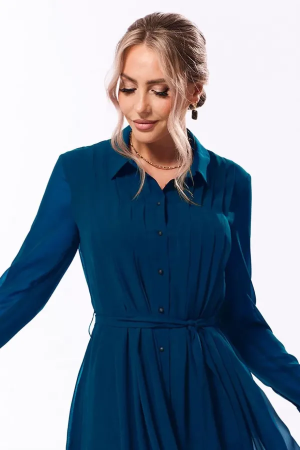 Платье, с центральной застежкой на петли и пуговицы, с втачным воротником с отрезной стойкой. По переду с односторонними складками, застроченными до талии. По спинке отрезное по линии талии. Нижняя часть спинки с односторонними складками. Рукав втачной, длинный, с отрезной манжетой, застегивающейся на одну петлю и пуговицу. Платье со съемным поясом.
