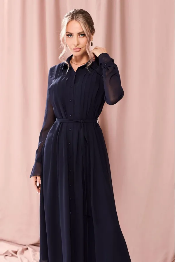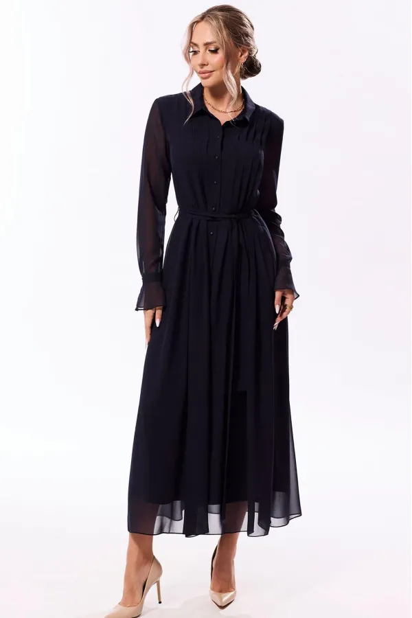 Платье, с центральной застежкой на петли и пуговицы, с втачным воротником с отрезной стойкой. По переду с односторонними складками, застроченными до талии. По спинке отрезное по линии талии. Нижняя часть спинки с односторонними складками. Рукав втачной, длинный, с отрезной манжетой, застегивающейся на одну петлю и пуговицу. Платье со съемным поясом.