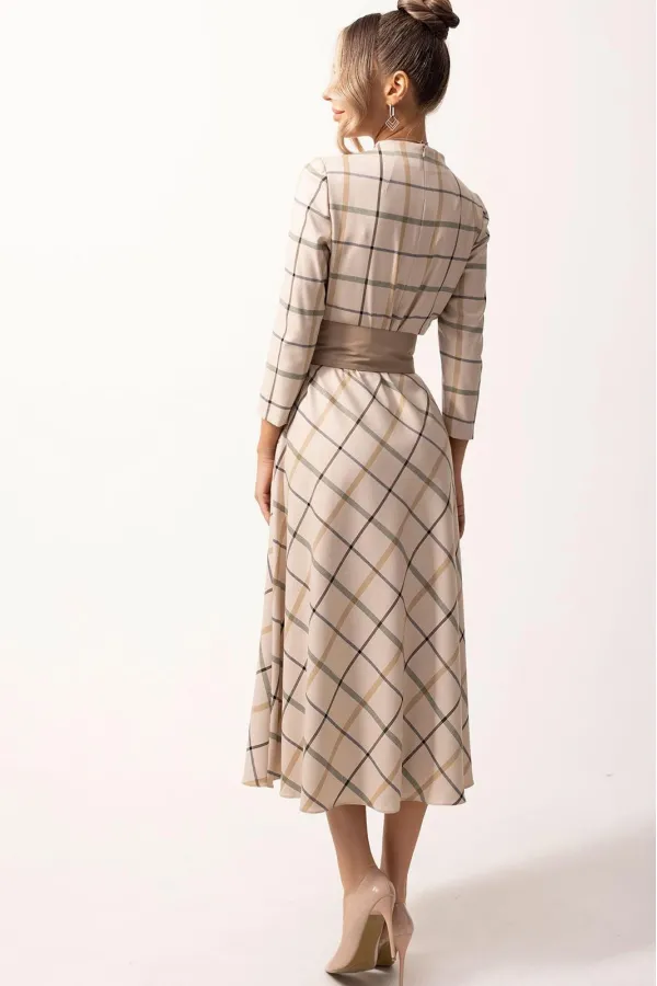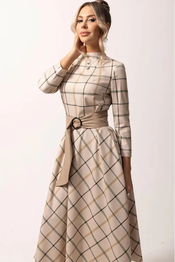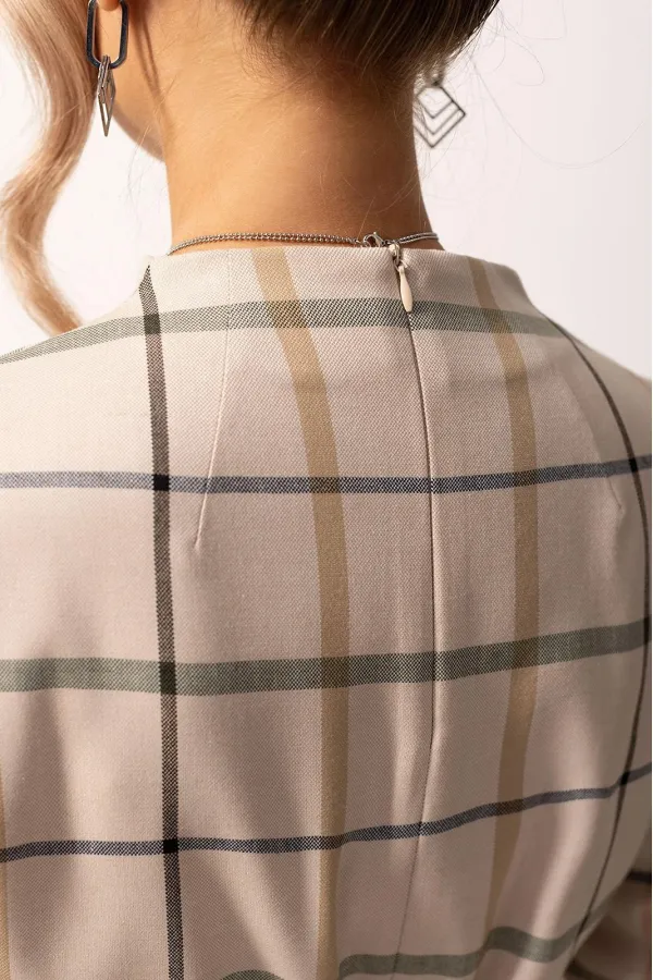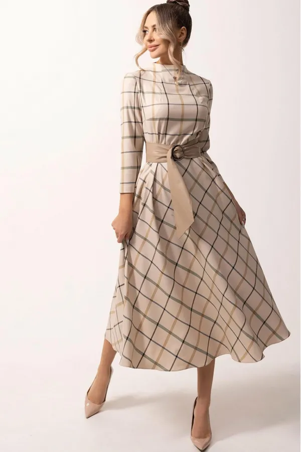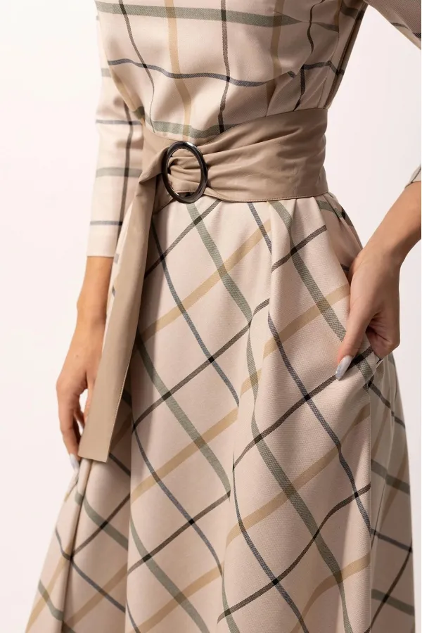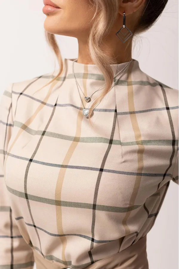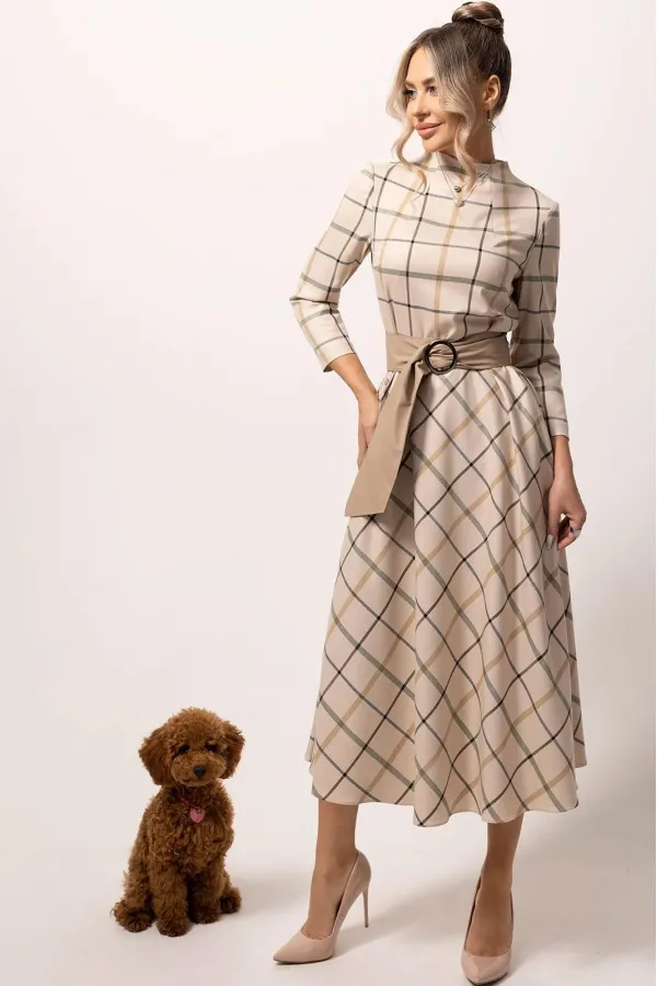 Платье с центральной застежкой на потайную молнию в среднем шве спинки, цельнокроенной стойкой с вытачками. Платье отрезное по линии талии. Верхняя часть переда с нагрудными вытачками. Верхняя часть спинки со средним швом. В боковых швах расположены карманы. Платье со съемным поясом. Платье без подкладки.