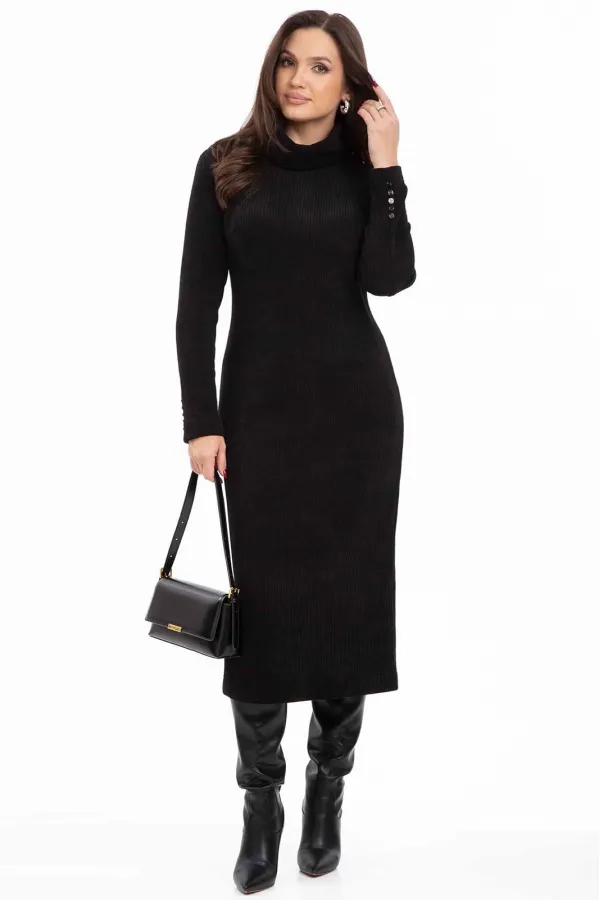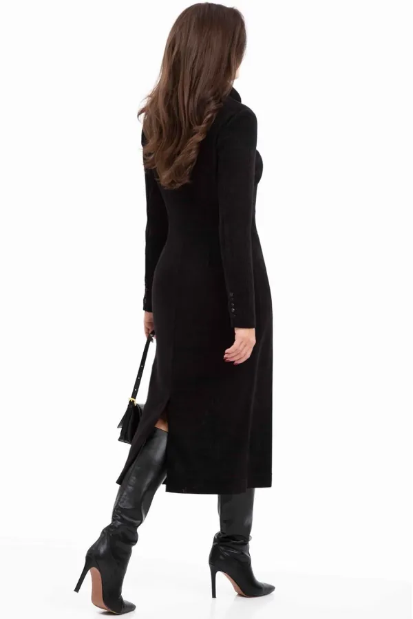 Платье без застежки, с отрезным воротником- хомут. Перед с нагрудными вытачками. Спинка с талиевыми вытачками, средним швом, заканчивающимся шлицей. Рукав втачной, длинный, двухшовный.