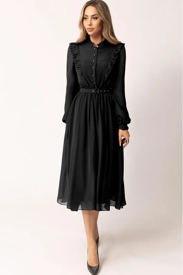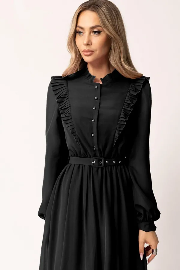 Платье, с воротником- стойкой, центральной застежкой на петли и пуговицы. Платье отрезное по линии талии. Шов по талии присборен на резинку. Верхняя часть переда с рельефами, выходящими из плеча, рюшей, выходящей из рельефов. Верхняя часть спинки с рельефами, выходящими из плеча и рюшей, выходящей из рельефов. Рукав втачной, длинный, с отрезной манжетой. По окату и шву притачивания манжеты рукав присборен. Платье со съемным поясом. Платье на подкладке.