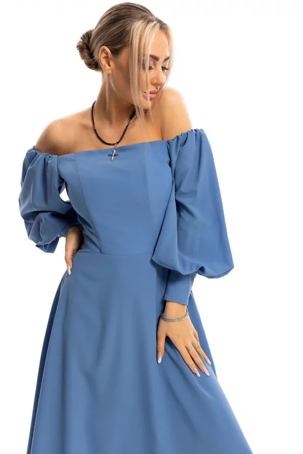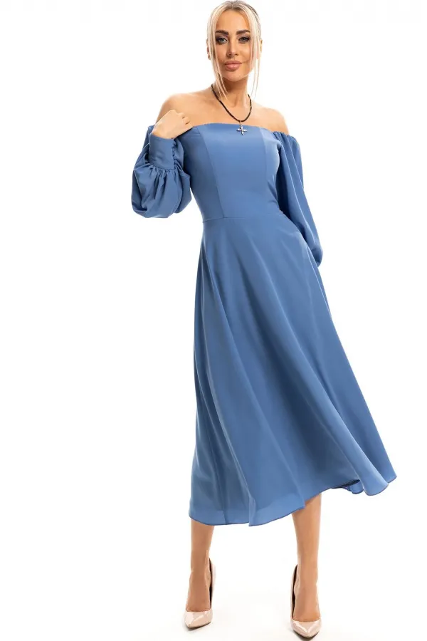 Платье без воротника, с фигурным вырезом вырезом горловины, застежкой на потайную молнию в среднем шве спинки. Платье отрезное по линии талии. Лиф с рельефами, выходящими из горловины. Рельефные швы лифа усилены регилином. Лиф спинки с рельефами, выходящими из горловины. Спинка со средним швом. Рукав втачной, длинный, с отрезной манжетой. По окату рукава-притачная планка, присборенная на резинку. Низ рукава присборен по шву притачивания манжет.