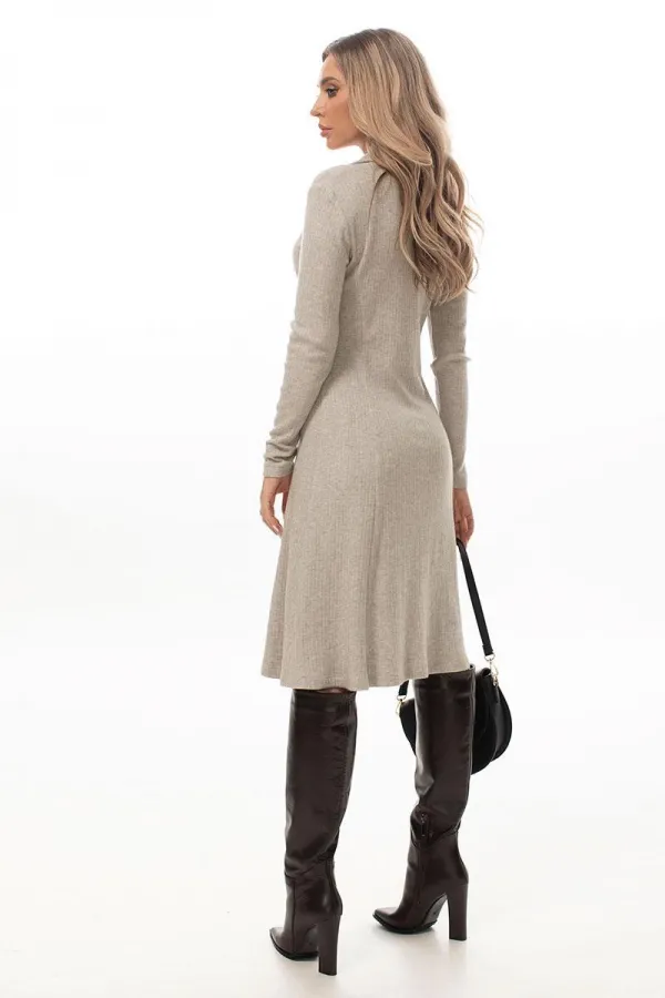 Платье с отложным воротником, втачной планкой по переду, V-образным вырезом горловины. Перед с рельефами, выходящими из проймы, нагрудными вытачками. Спинка с рельефами, выходящими из проймы. Рукав втачной, длинный.