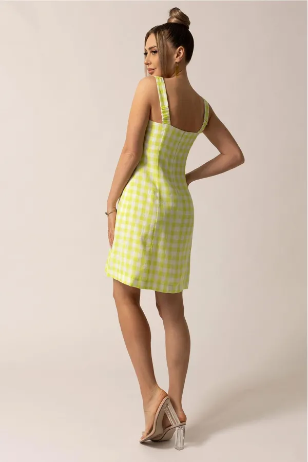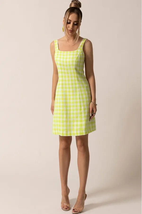 Платье без воротника, на бретелях, с фигурным вырезом горловины, застежкой на потайную молнию в среднем шве спинки. По переду с рельефными швами, выходящими из проймы. Спинка со средним швом, рельефами, выходящими из проймы. Со стороны спинки бретели частично присборены на резинку. Платье на подкладке.