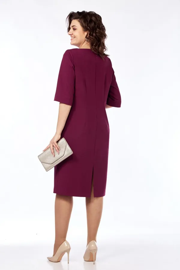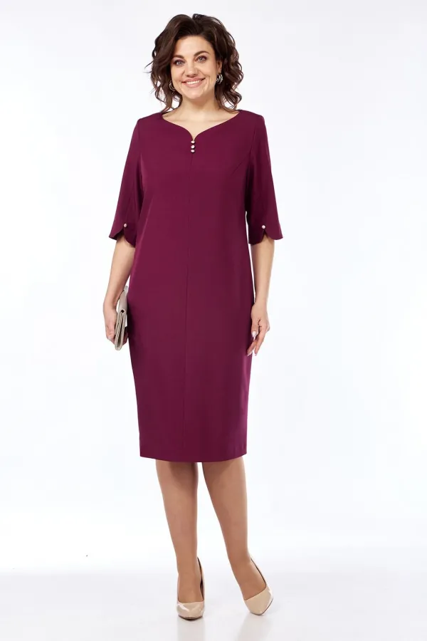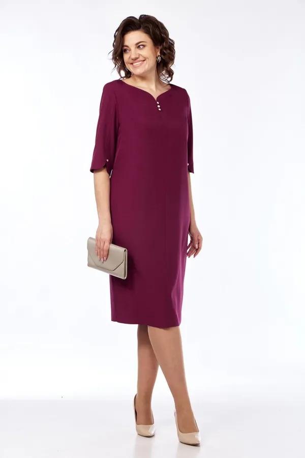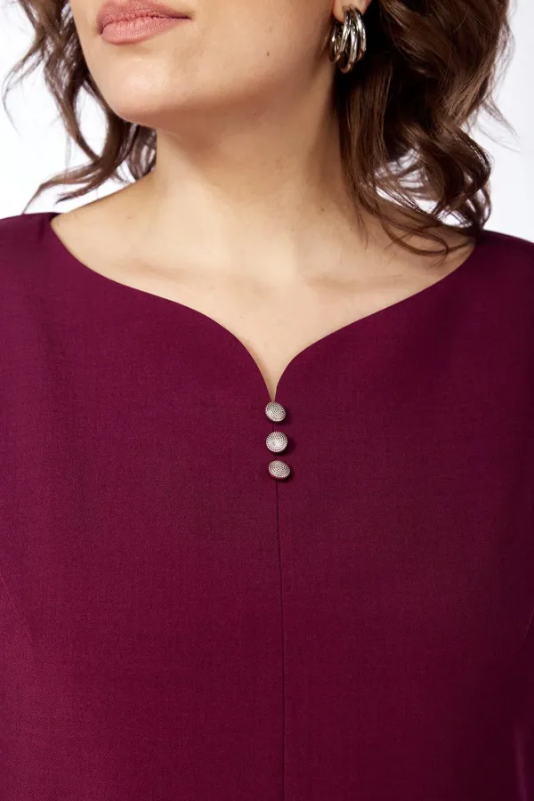Платье женское, нарядное полуприлегающего силуэта. Выполнено из плательной ткани. Горловина фигурной формы обработана обтачкой. Перед с нагрудными вытачками и средним швом в котором имеется разрез. Спинка со средним швом и талиевыми вытачками. Рукава втачные, одношовные с небольшим разрезом по шву. Платье декорировано пуговицами.