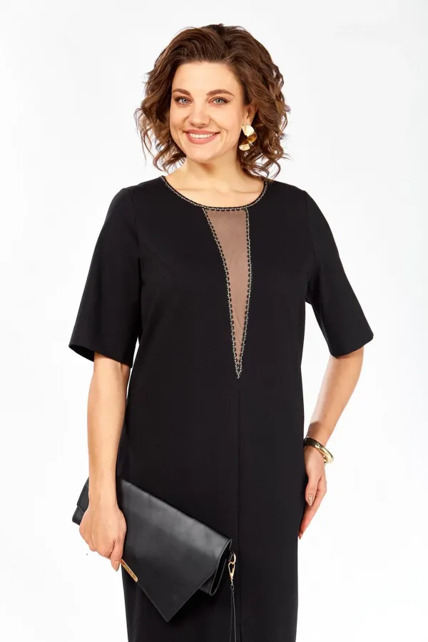 Платье женское, нарядное, полуприлегающего силуэта выполнено из трикотажного полотна. Горловина круглой формы. По переду обработаны нагрудные вытачки и фигурная вставка из отделочной ткани. По горловине и вставке декора... Читать далее...