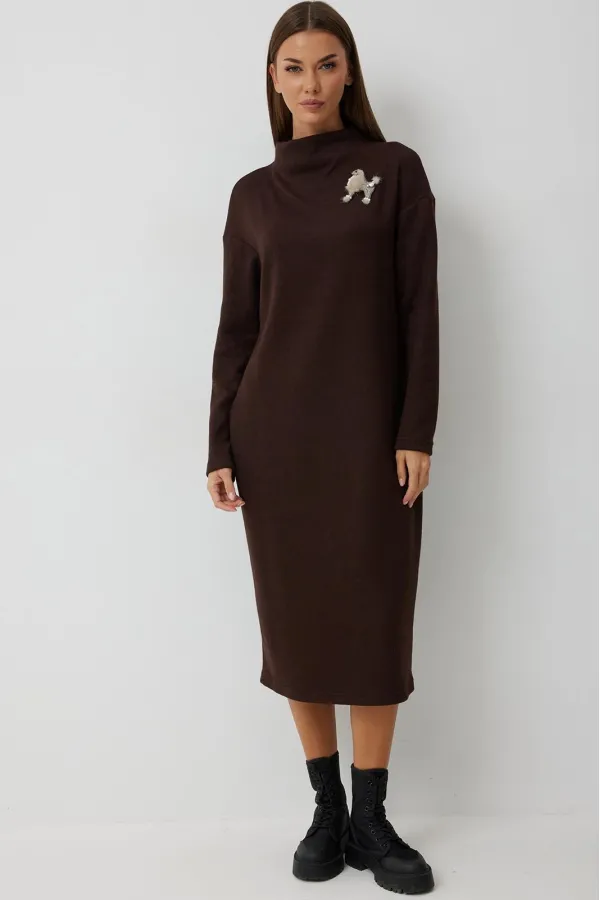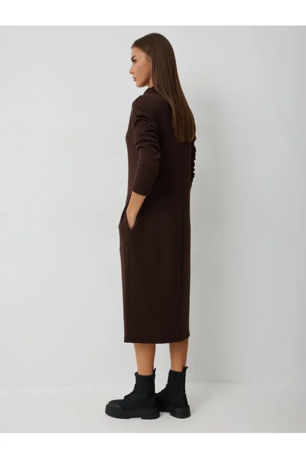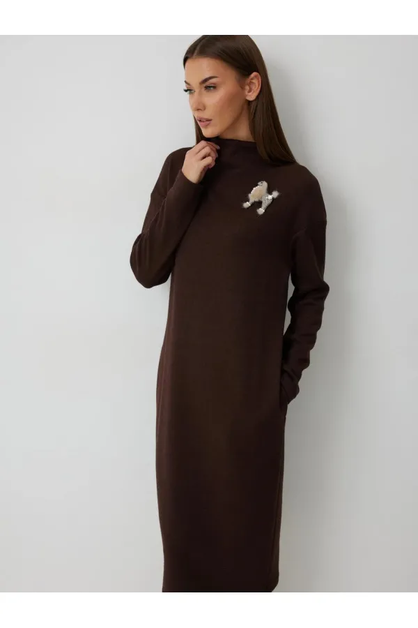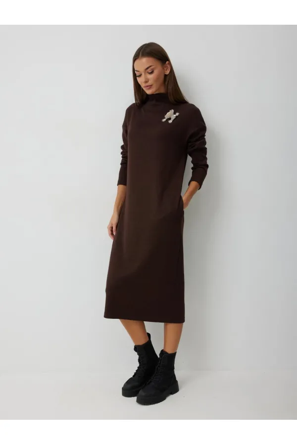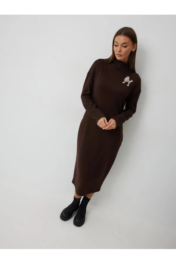 Платье трикотажное полуприлегающего силуэта с карманами в боковом шве. Длина платья до середины икры. Платье с цельнокроеной горловиной и спущенной линией плеча. Спинка со средним швом. Платье дополнено съемным авторским декором.