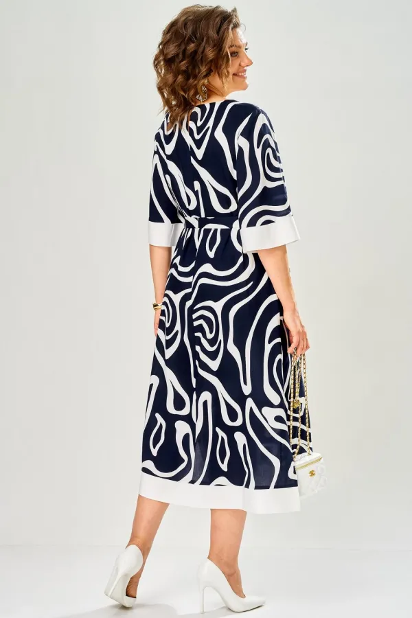 Платье из лёгкой вискозы. На тонкой подкладке. Силуэт прямой, к низу слегка расширен. Нагрудные вытачки. Горловина овальная. Рукав втачной, чуть расширен к низу. По низу рукава и платья отделка по низу однотонной светлой тканью. Платье без застёжки. Мягкий съёмный пояс из основного полотна.