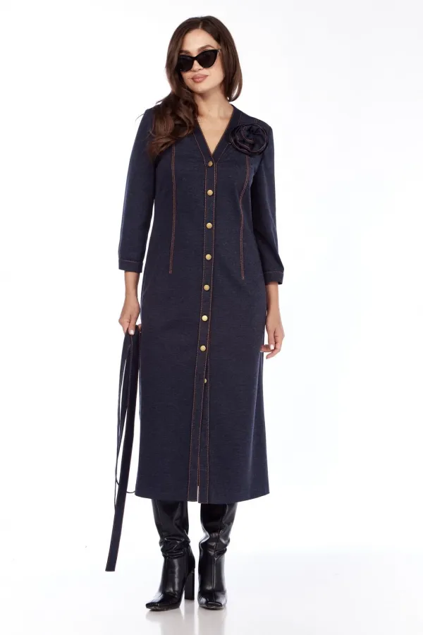 Платье выполнено из трикотажного полотна. V образный вырез горловины, втачной рукав и застежка на пуговицы. По переду и спинке рельефы, карманы в боковых швах. Пояс и декоративный цветок в комплекте .... Читать далее...