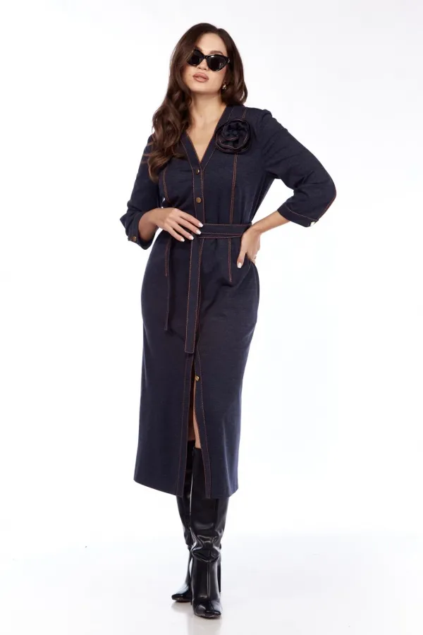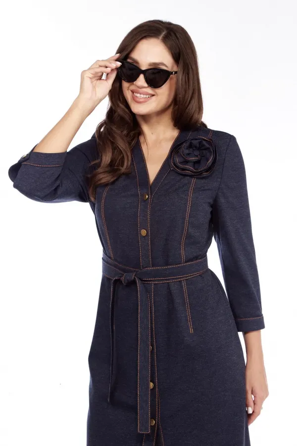 Платье выполнено из трикотажного полотна. V образный вырез горловины, втачной рукав и застежка на пуговицы. По переду и спинке рельефы, карманы в боковых швах. Пояс и декоративный цветок в комплекте .