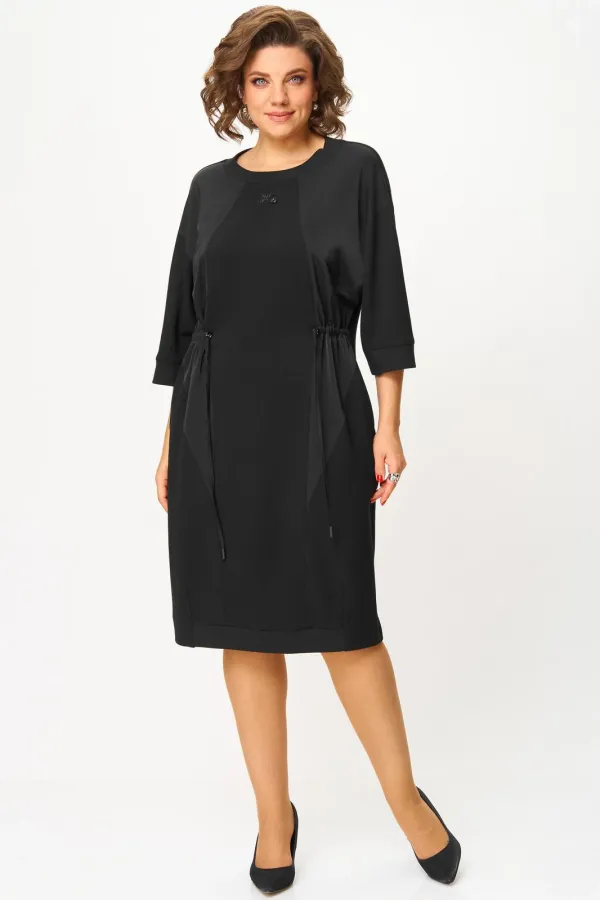 Платье женское, выполнено из трикотажного полотна с декоративными вставками из сатина в цвет основного полотна. Силуэт прямой, приталенный за счёт кулисы по передней части платья.