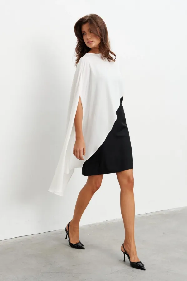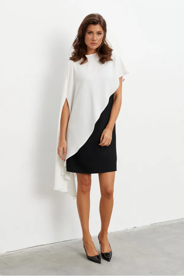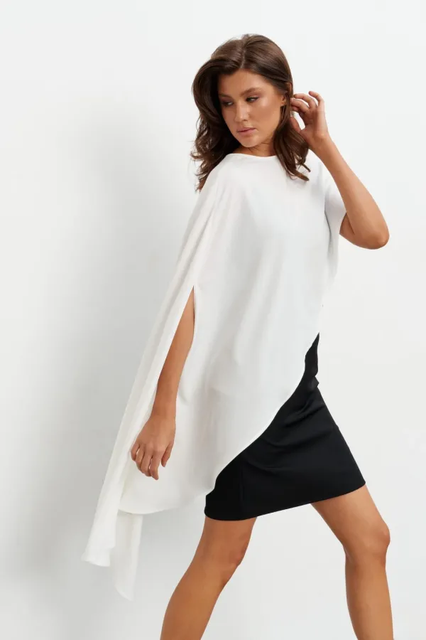 Блузка из струящейся ткани по форме напоминает кейп. Левая сторона короче и спадает с плеча, а правая - длинная с прорезью для руки. Сзади по горловине застёжка на пуговицу.