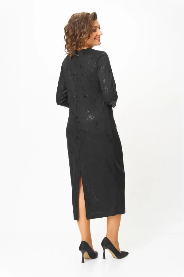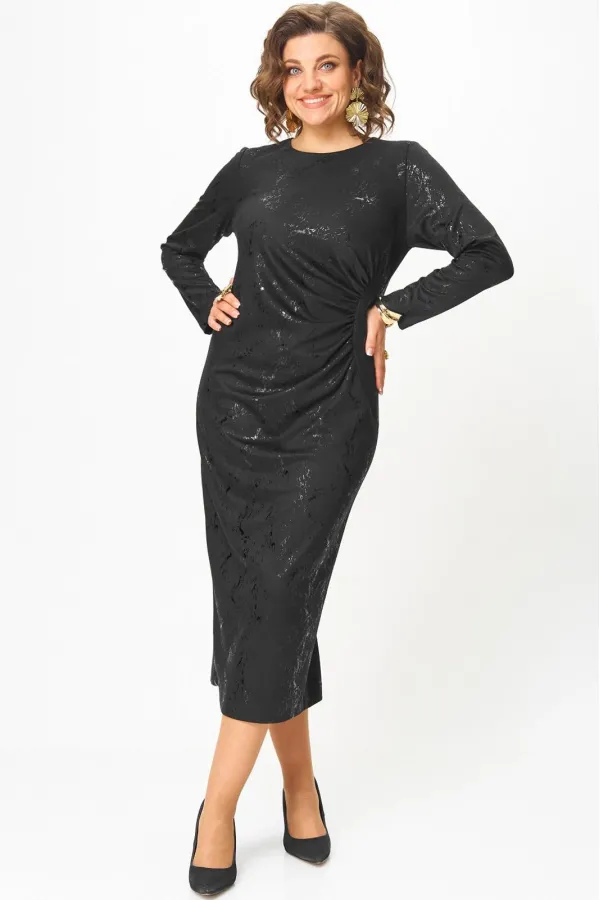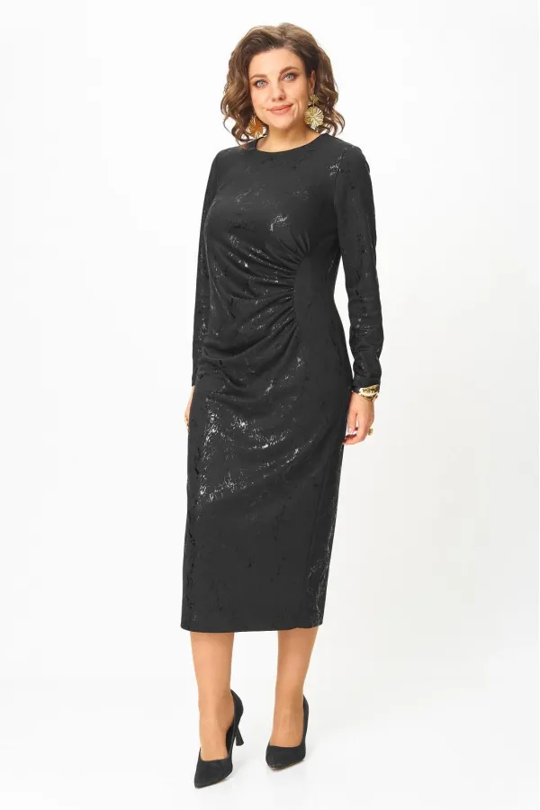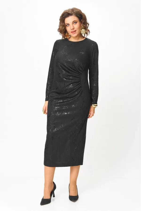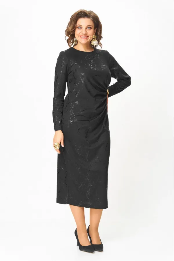Нарядное женское платье из трикотажного полотна с добавлением вискозы. Нарядность платью придает блестящий рисунок в тон основного цвета. Силуэт прилегающий, удлиненное, по переду фигурный подрез и драпировка, вырез горловины круглый с застежкой на потайную молнию по спинке и разрезом, рукав длинный.