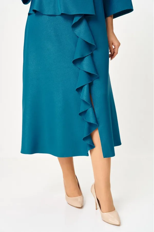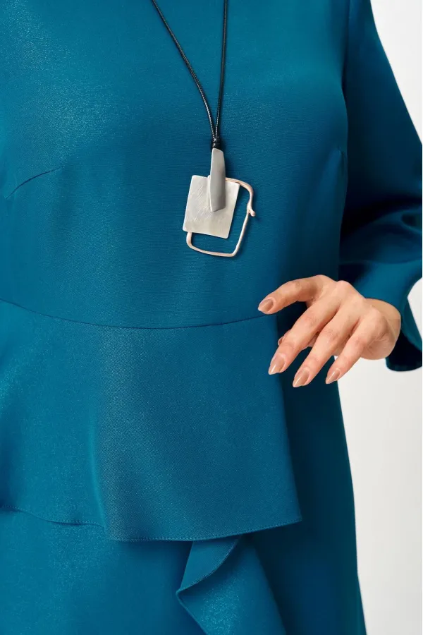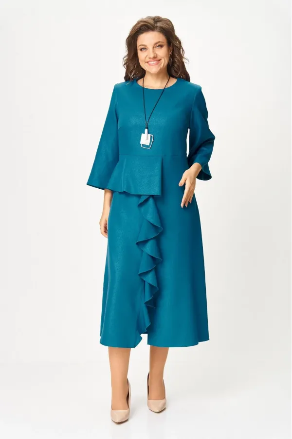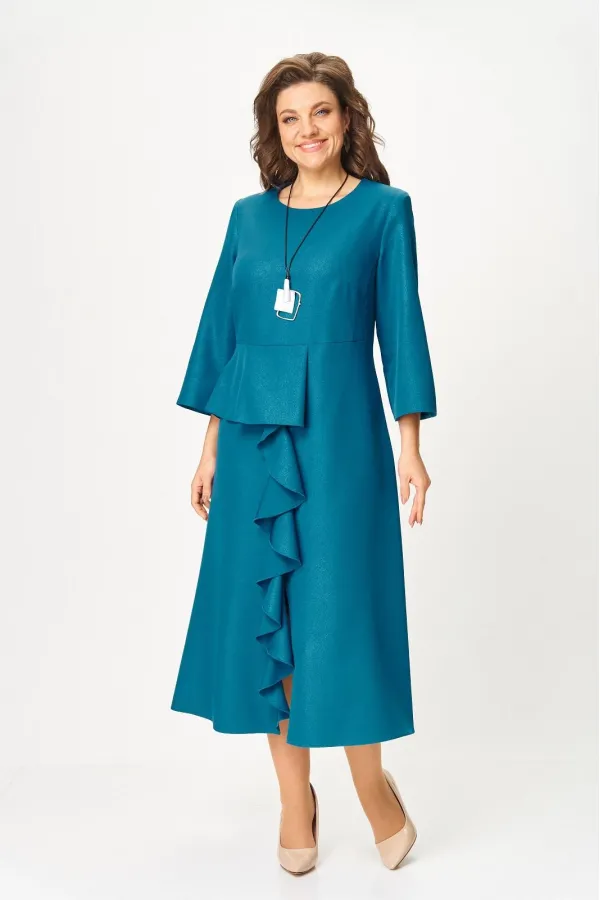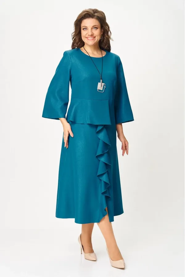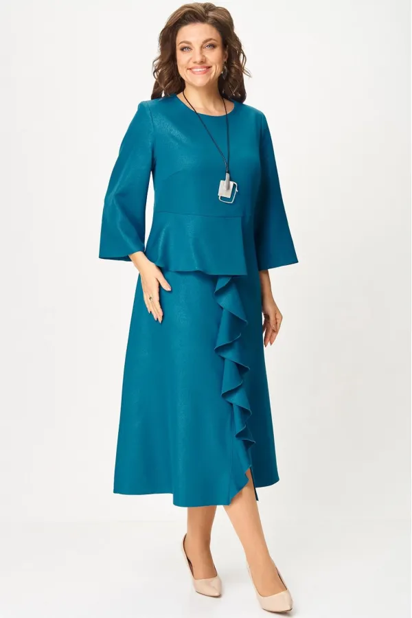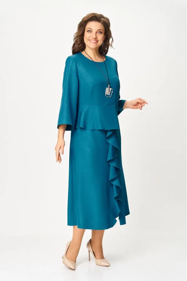 Нарядное женское платье из плательной ткани с легким блеском. Удлиненное, силуэт полуприлегающий, по переду отрезное по линии талии, с баской, воланом в шве и высоким разрезом по низу, вырез горловины круглый, с застежкой на потайную молнию в среднем шве по спинке, рукав 3/4 расширенный к низу.