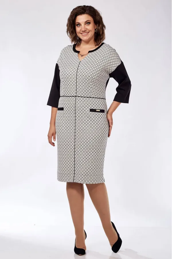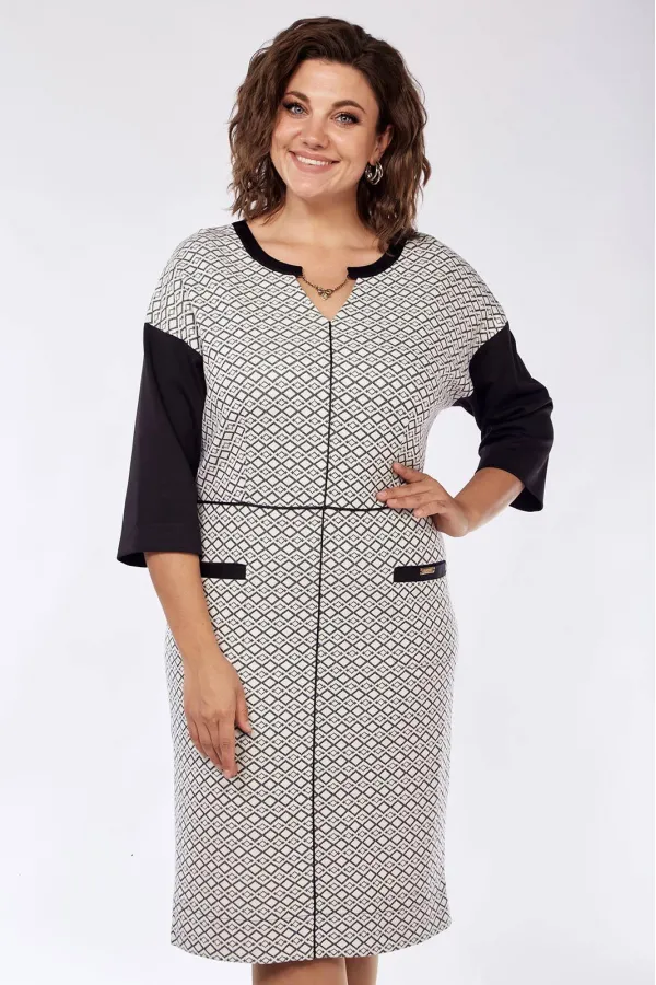 Платье женское полуприлегающего силуэта, из трикотажного полотна. С фигурным вырезом горловины, обработанным отделочными деталями, с украшением. Отрезное по талии, с кантом, с талиевыми вытачками. Со средним швом, с кантом. Юбка переда с карманами с листочкой. Спинка со средним швом и талиевыми вытачками. Со спущенной линией плеча, одношовными рукавами, длиной 3/4. Небольшие разрезы в боковых швах. Деталь переда из отделочного материала. Размеры 44-48: длина платья 100 см, длина рукава 33 см. Раззмеры 50-54: длина платья 102 см, длина рукава 35 см.