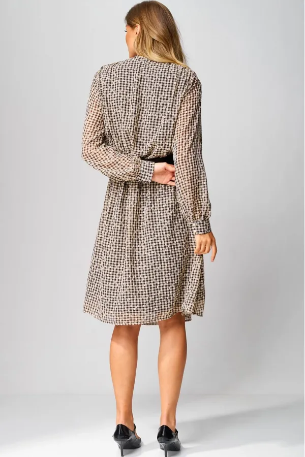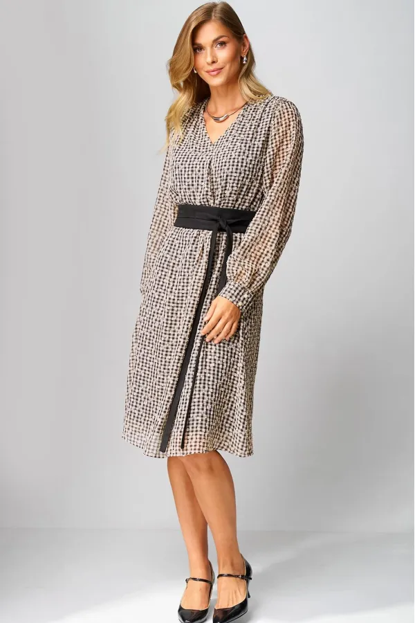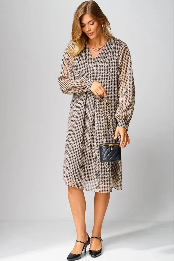 Платье женское, повседневное, на подкладке,свободного силуэта, расширенное книзу, длиной ниже коленей, с втачными рукавами, со съемным поясом. Вырез горловины детали переда платья «V-образной» формы, по центру обработана складка. По плечевым швам обработана сборка. Рукава втачные одношовные, с притачными манжетами, с застежкой на 2 петли и 2 пуговицы. Разрезы обработаны окантовкой, по швам притачивания обработана сборка.