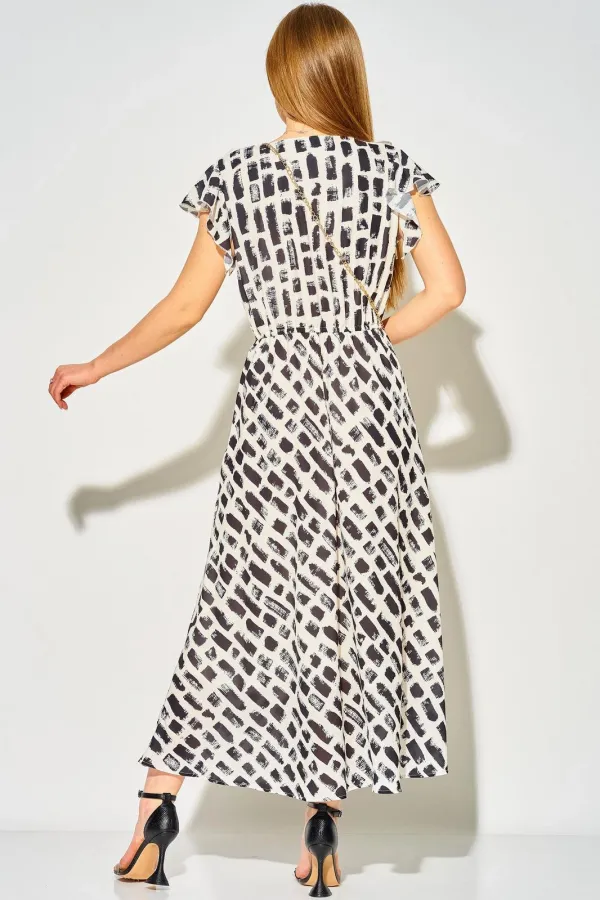 Платье плавно расширяется к низу, отрезное на уровне талии. Вырез горловины округлый с изящным разрезом и застежкой на навесную петлю с пуговицей. Лиф платья украшен вертикальными нежными воланасми из отделочной ткани, которые придают образу легкость и романтичность. В шов соединения лифа и юбки вставлена эластичная тесьма, что обеспечивает идеальную посадку. Рукава-«крылышки» добавляют нотку игривости и женственности.