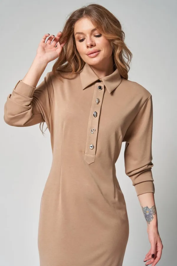 Вырез горловины округлой формы, воротник втачной с отрезной стойкой. Застежка на петли и пуговицы по планке и 1 петлю и пуговицу на стойке воротника. Перед платья с талиевыми вытачками, с втачными планками. Спинка платья с талиевыми вытачками. Рукава втачные одношовные длинные с притачными манжетами, на манжетах обработаны по 3 «защипа».