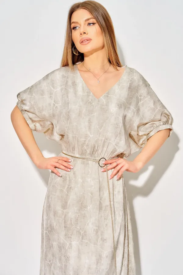 Длина платья до середины икр, отрезное на уровне линии талии, к низу расширенное. Вырез горловины платья «V-образной» формы, обработан обтачкой. Лиф детали переда со средним швом. Юбка платья на тонкой трикотажной подкладке. В шов соединения лифа и юбки вставлена эластичная тесьма. Рукава цельнокроеные, с ластовицей, и с притачной планкой, собраны на эластичную тесьму.