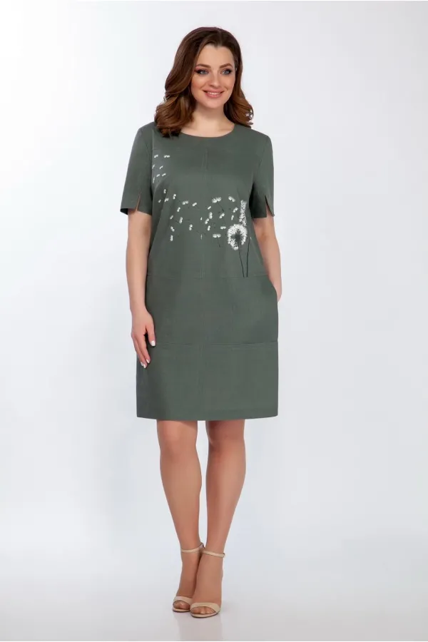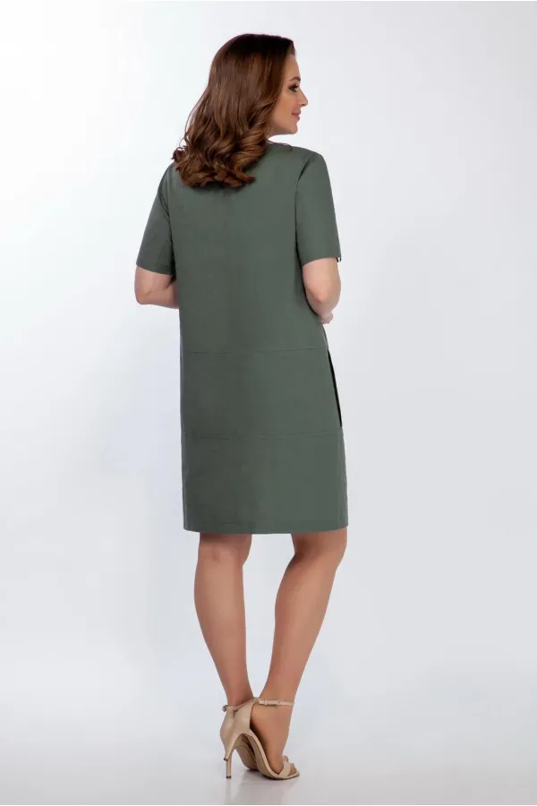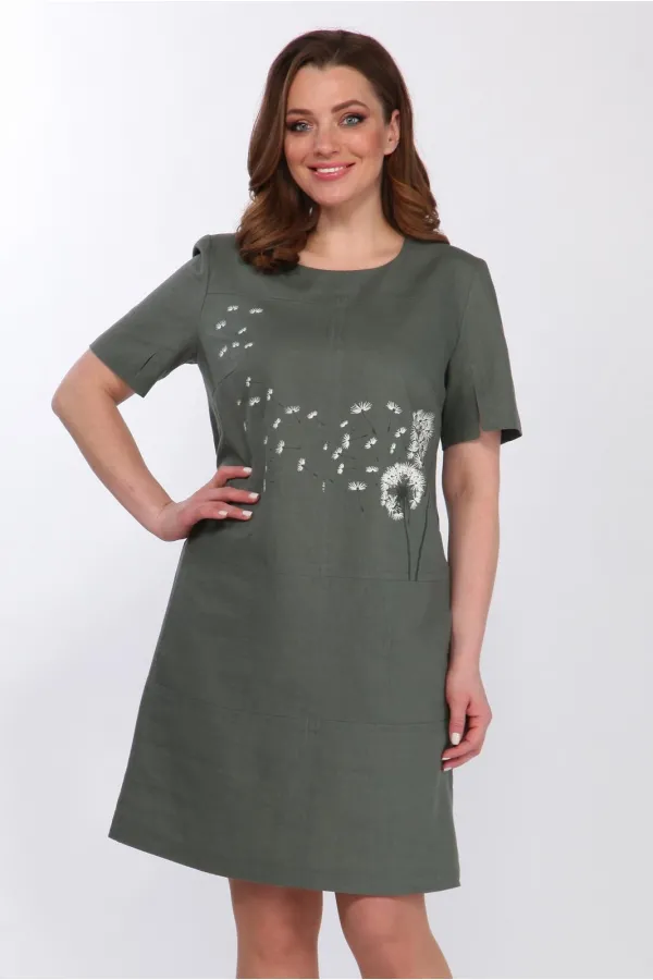 Платье полуприлегающего силуэта выполнено из натурального льна с вискозой и авторской печатью. Платье с функциональными карманами. Платье расширено к низу, длина до середины колена. Впереди центральный шов, подрезы и внутренние карманы, по спинке - центральный шов с застежкой молния и подрезы ниже талии. Рукав короткий, с разрезом. Линии притачивания подчеркнуты отделочными строчками. Длина платья сзади по спинке от плечевого шва 98 см, длина рукава 27см. Состав платья: 55% лен, 45% вискоза.