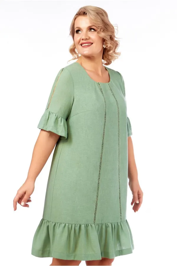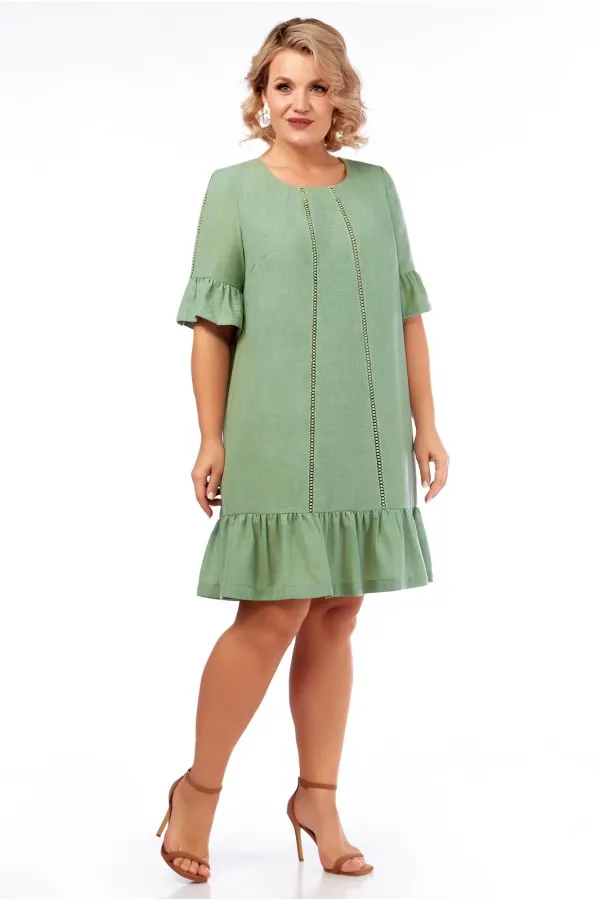 Платье А-силуэта, средней длины, на подкладке "Гранд". Овальный вырез горловины. Вытачки у выреза и нагрудные. Впереди вертикальными линиями вставлена тесьма, зрительно удлиняющая фигуру, по спинке шов и застежка "молния". Внизу платье оформлено воланом с легкой сборкой. Рукав пикрываент локоть, по внешнему шву - декор тесьмой, низ рукава оформлен воланом со сборкой.