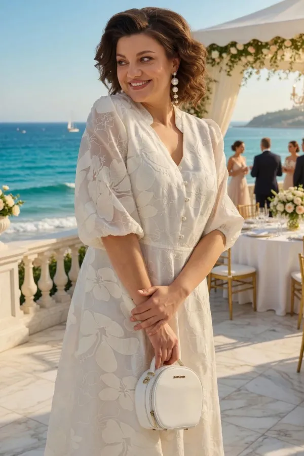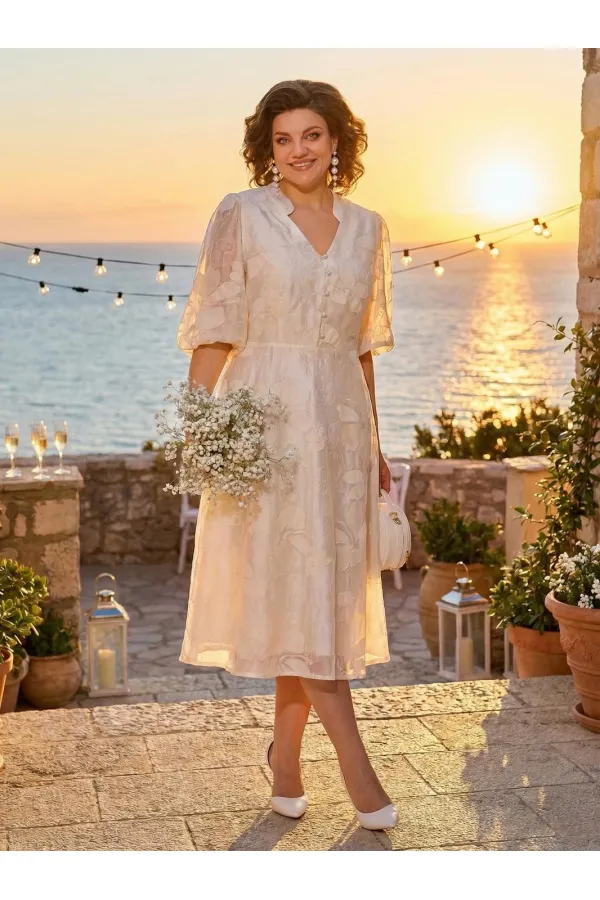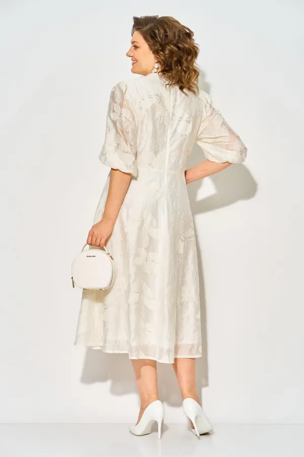 В преддверии торжественных мероприятий и праздников, мы приготовили для Вас это романтическое нарядное платье. Модель платья длины миди имеет углубленный V-образный вырез с навесными пуговками в виде жемчуга. По талии платье отрезное с расклешенной юбкой. Рукав фонарик, присборен на резинке по низу. Модель на хлопковой подкладке. По спинке предусмотрена потайная молния.