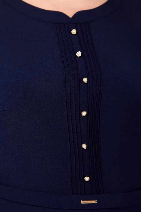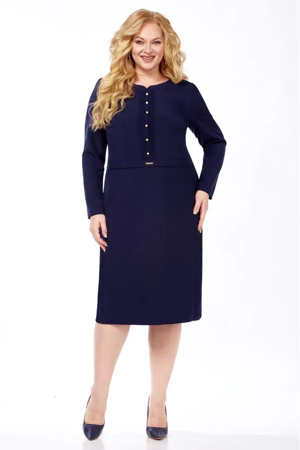 Текстильное женское платье полуприлегающего силуэта на рост 164см средней длины. Вырез горловины круглый с фигурной обтачкой. Рукав втачной длинный. Перед платья с рельефами из проймы и нагрудными вытачками. По спинке средний шов с молнией и шлицей. Лиф дополнен вертикальными защипами и декоративными пуговицами, по талии пояс.