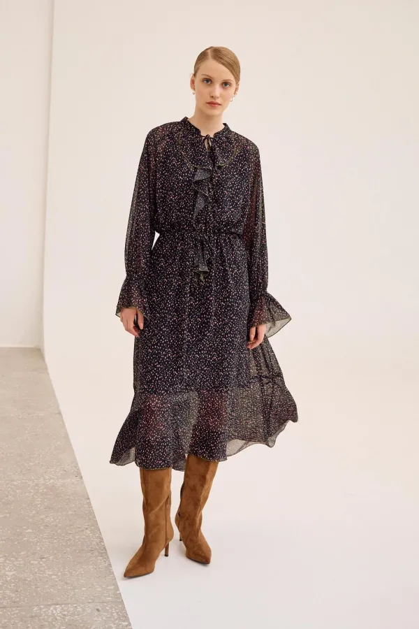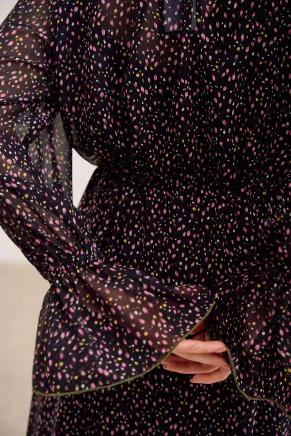 Платье свободного кроя, выполнено из шифона, дизайн горох. Рукав длинный реглан, по низу рукава резинка. Глубокий V-образный вырез горловины, в который вставлена рюша, по горловине стойка на завязку, по середине выреза застежка на навесной потайной крючок. По линии талии по переду и спинке кулиса на завязку, по низу платья притачной волан. В комплект входит платье-комбинация из трикотажной подкладки на бретелях.Платье: