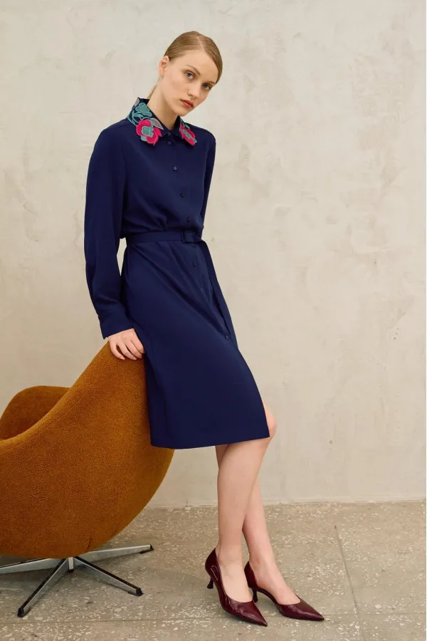 Платье-рубашка прямого силуэта с центральной застежкой на петли и пуговицы. Рукав длинный втачной с отрезной манжетой и застежкой на петли и пуговицы. Воротник рубашечного кроя, декорирован вышивкой. По спинке отрезная кокетка и складки. В комплекте съемный пояс.Платье: