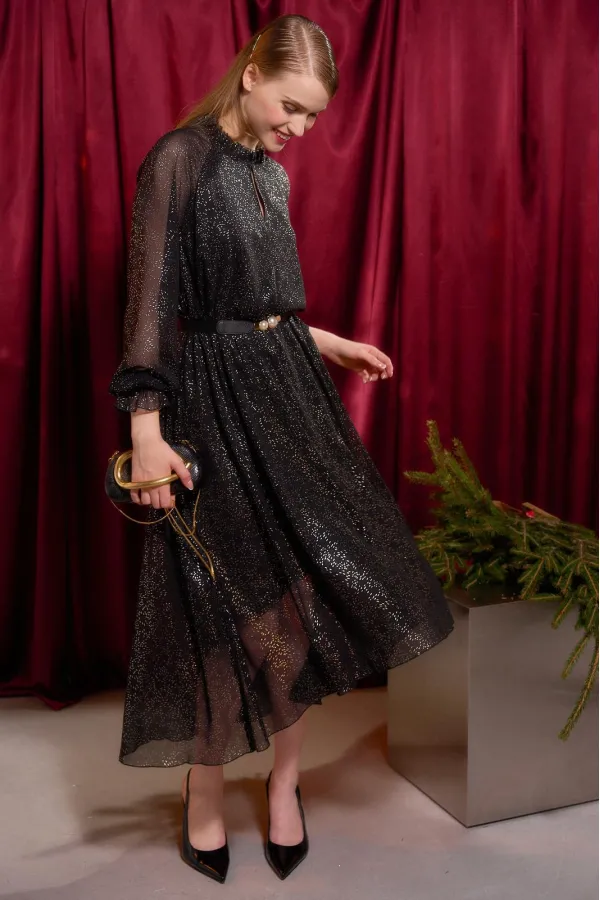 Платье длины миди А-силуэта выполнено из шифона, по переду и спинке на подкладке. Широкий длинный рукав-реглан. По низу рукава прошита резинка в несколько рядов. Горловина с невысокой стойкой на сборку. По переду средний шов, у основания шеи переходящий в застёжку на навесной крючок. Низ платья ассиметричный. Пояс входит в комплектацию.Длина платья по спинке от высшей точки горловины: 130 см