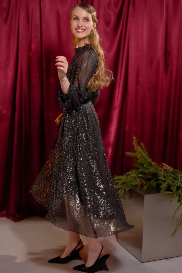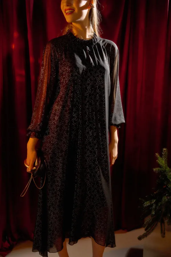 Платье длины миди А-силуэта выполнено из шифона, по переду и спинке на подкладке. Широкий длинный рукав-реглан. По низу рукава прошита резинка в несколько рядов. Горловина с невысокой стойкой на сборку. По переду средний... Читать далее...