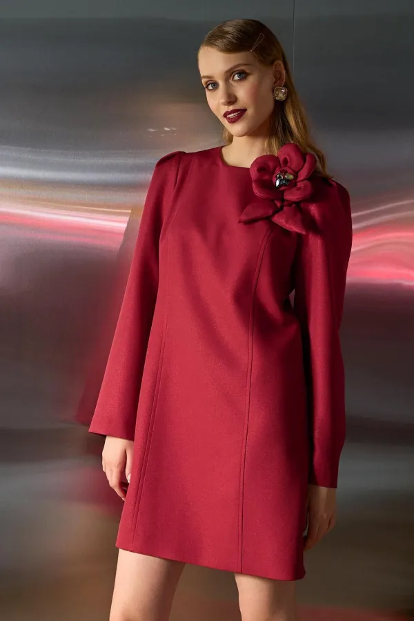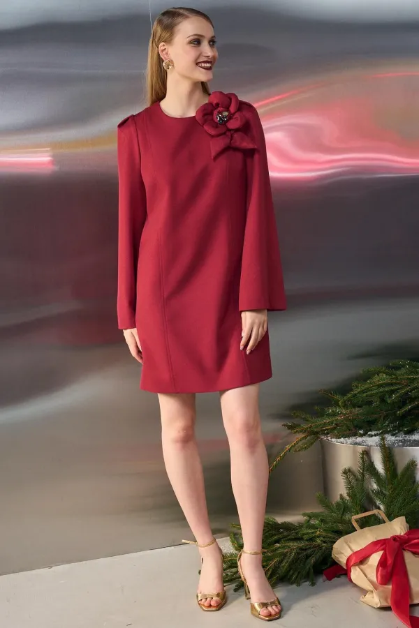 Платье свободного кроя, выполнено из плательной ткани, на подкладке. Рукав втачной, расширенный к низу, по верхней части рукава складки. Округлый вырез горловины, по переду и спинке вертикальные рельефы. По спинке средний шов, переходящий в застежку на потайную молнию. К платью предлагаем брошь-цветок.Длина по спинке от высшей точки горловины: 87 см