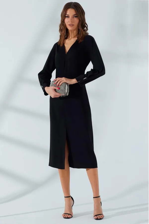 Стильное платье из плательной струящейся ткани полуприлегающего силуэта. Горловина фигурной формы. По среднему шву спинки потайная молния. Перед с нагрудными вытачками от среднего шва, заканчивающегося разрезом. Спинка с... Читать далее...