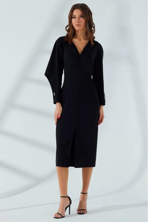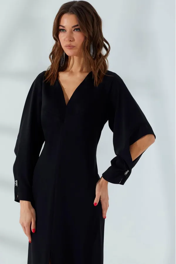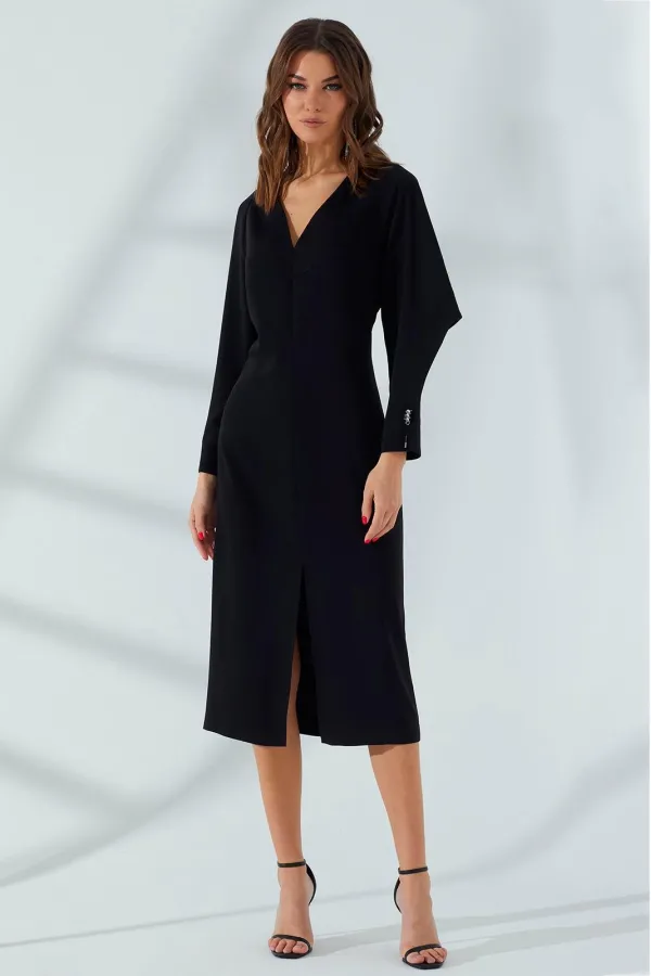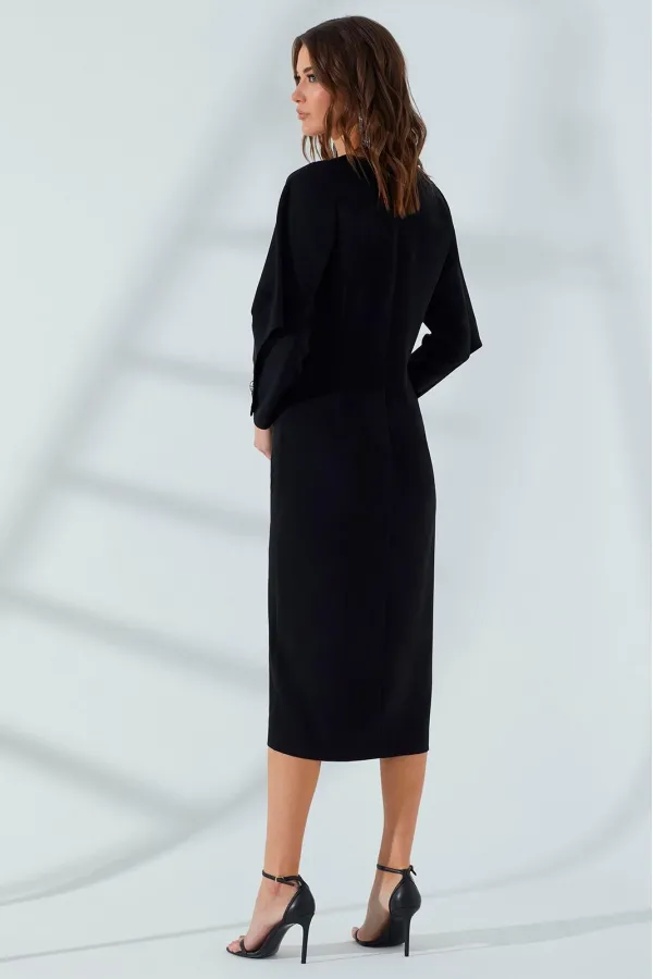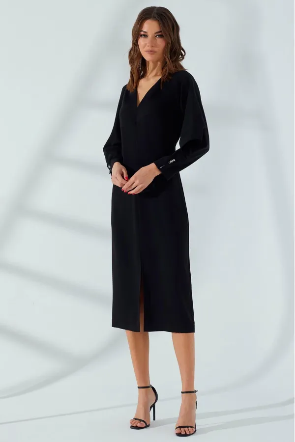 Стильное платье из плательной струящейся ткани полуприлегающего силуэта. Горловина фигурной формы. По среднему шву спинки потайная молния. Перед с нагрудными вытачками от среднего шва, заканчивающегося разрезом. Спинка с вытачками по талии. Рукав покроя реглан с фигурным вырезом и застежкой на декоративную булавку. Рост 164-170. Длина изделия: 115см (44-48р), 117см (50-54р), 119см (56-60р). Длина рукава (от горловины до выреза): 42см