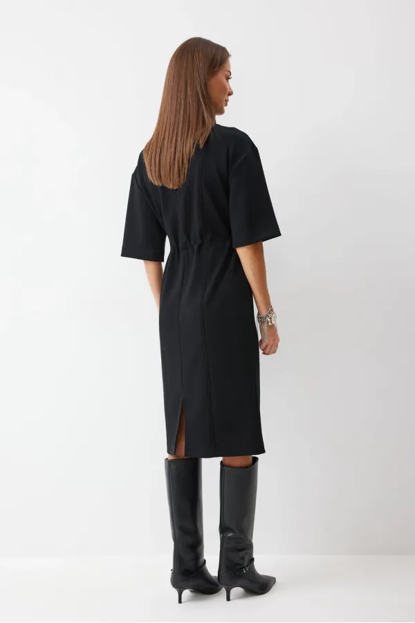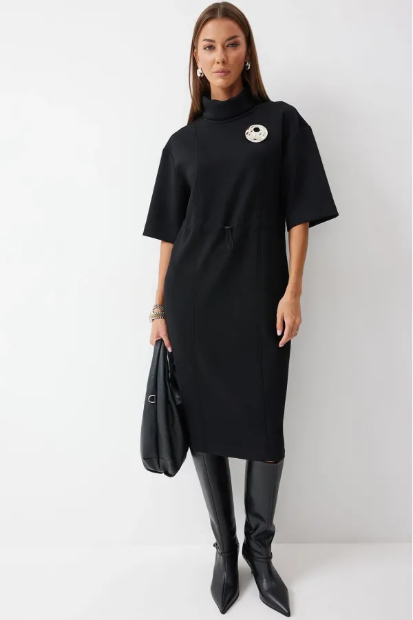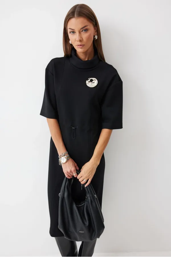 Платье прямого силуэта из трикотажного полотна. Горловина-стойка. Рукав со спущенной линией плеча, с коротким рукавом. На спинке в центральном шве по низу разрез. По переду и спинке декоративные рельефы. В районе талии кулиса с фиксатором для регулирования степени прилегания. В комплект входит съемная брошь. Обращаем ваше внимание, что фурнитура может отличаться от фото.