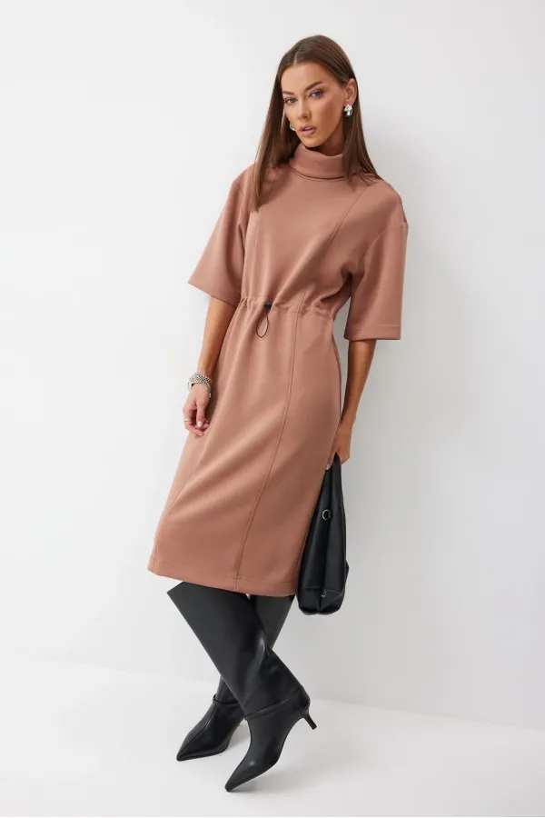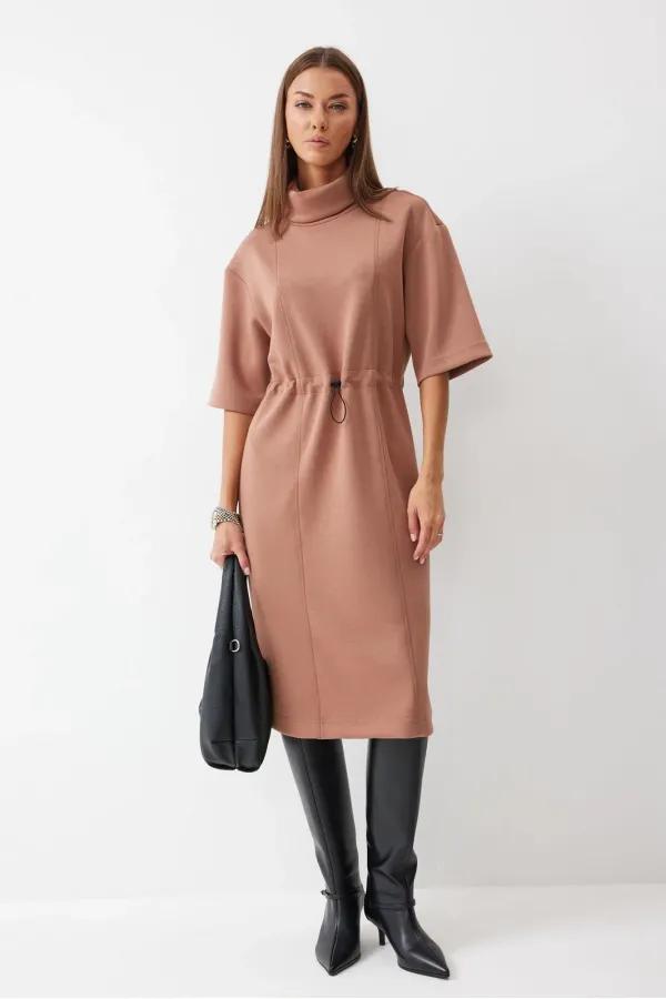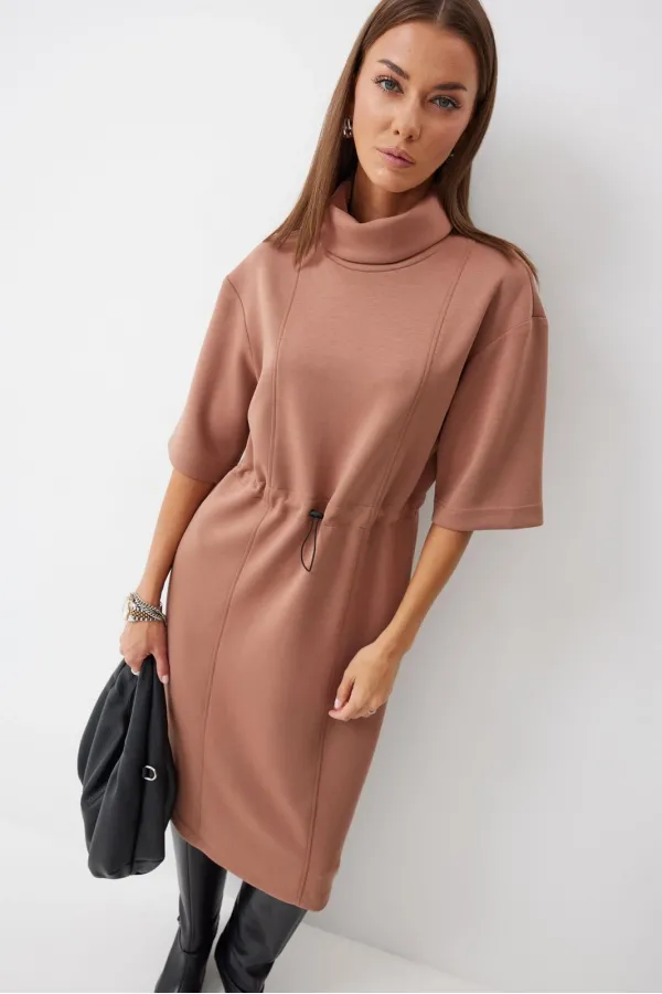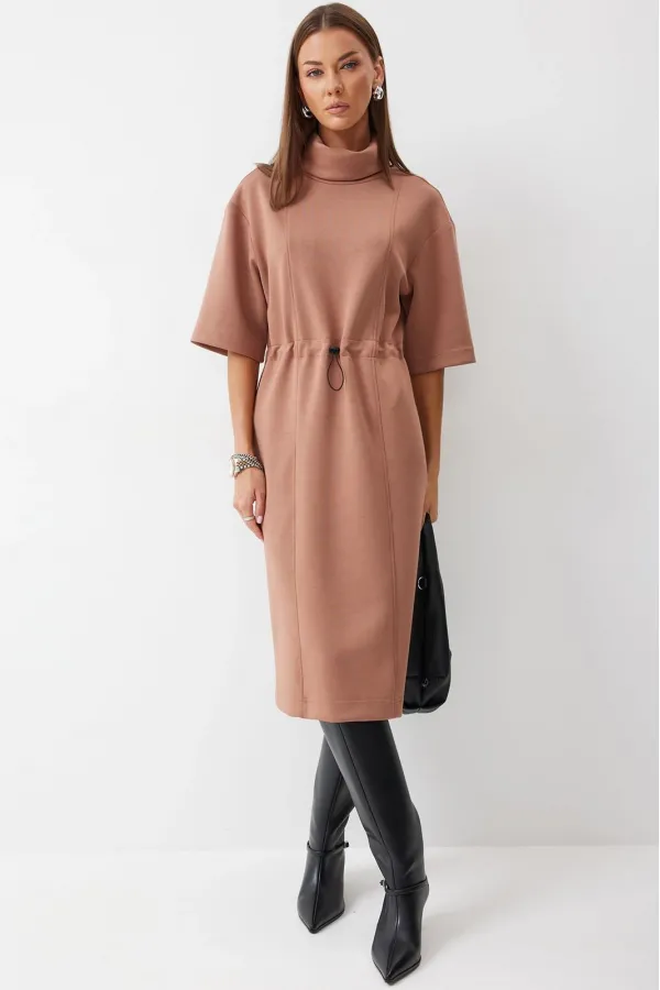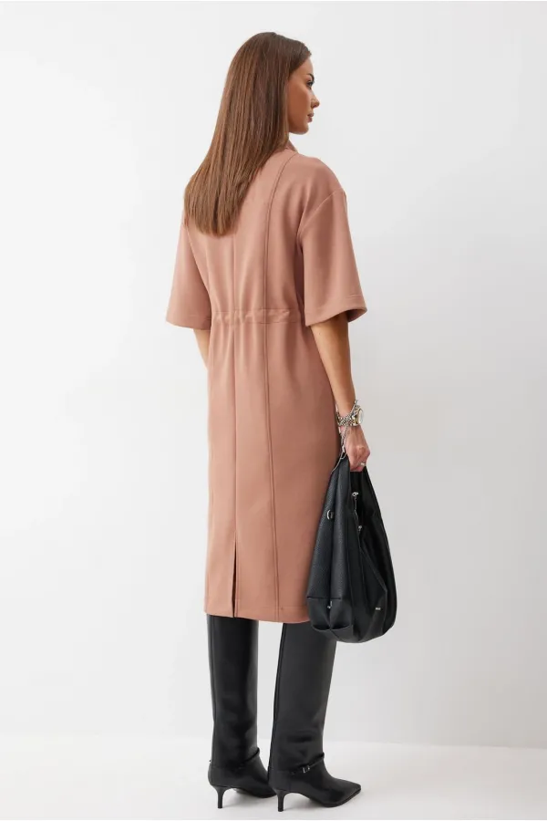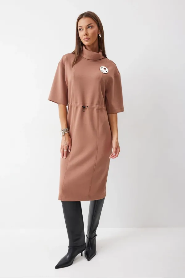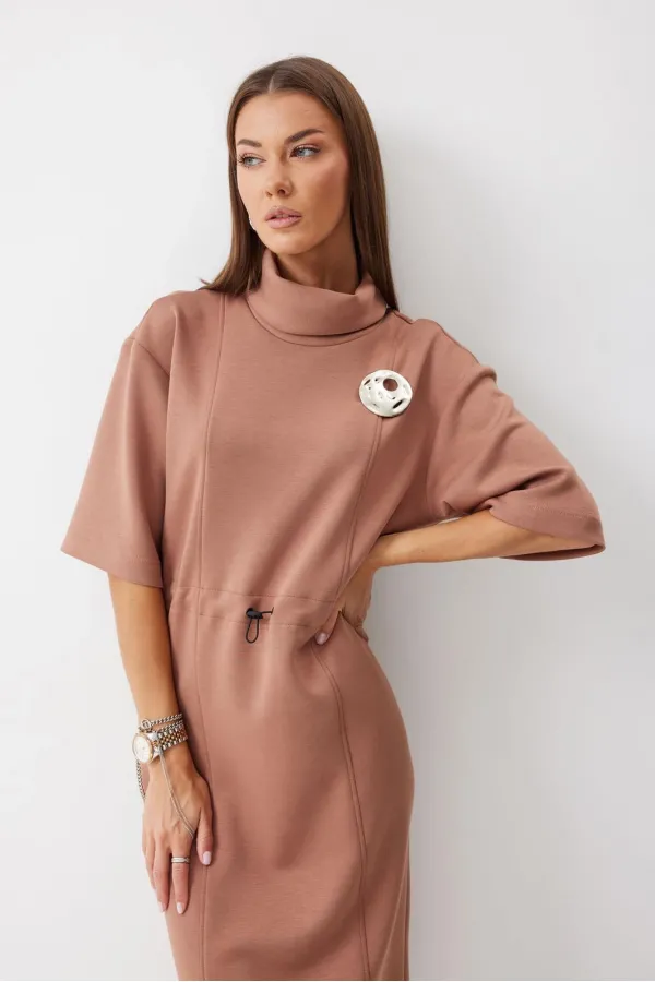 Платье прямого силуэта из трикотажного полотна. Горловина-стойка. Рукав со спущенной линией плеча, с коротким рукавом. На спинке в центральном шве по низу разрез. По переду и спинке декоративные рельефы. В районе талии кулиса с фиксатором для регулирования степени прилегания. В комплект входит съемная брошь. Обращаем ваше внимание, что фурнитура может отличаться от фото.