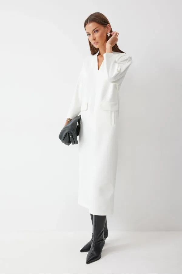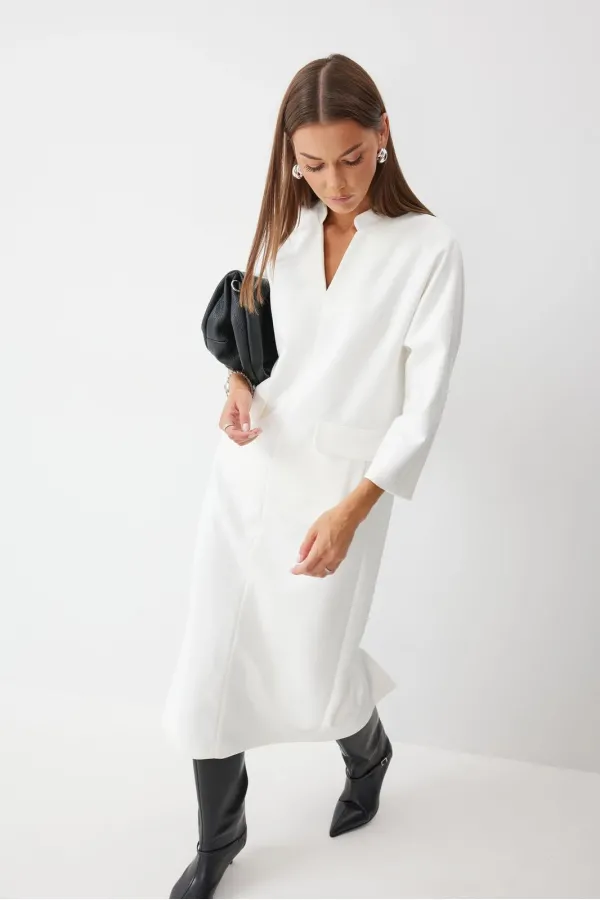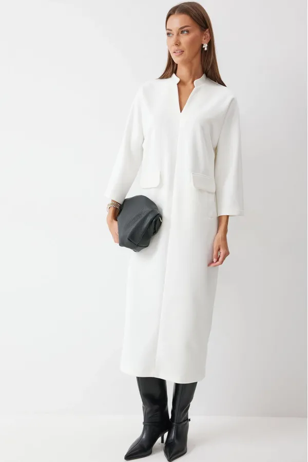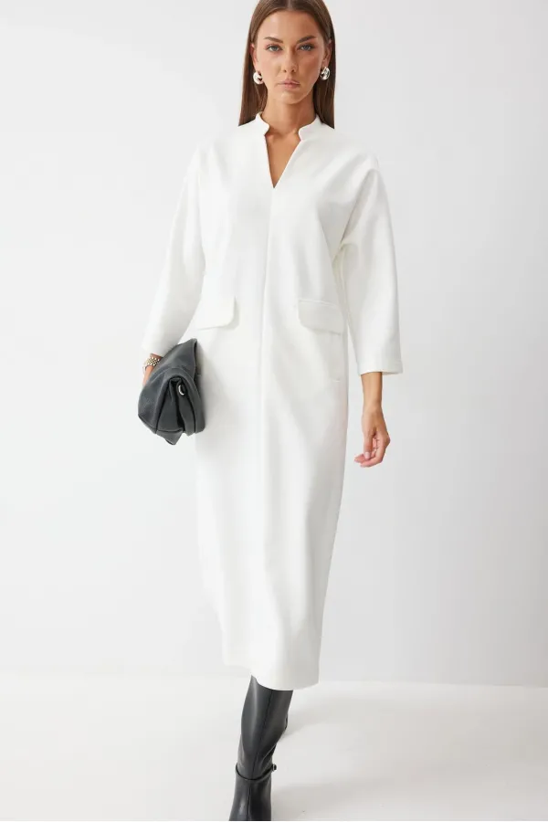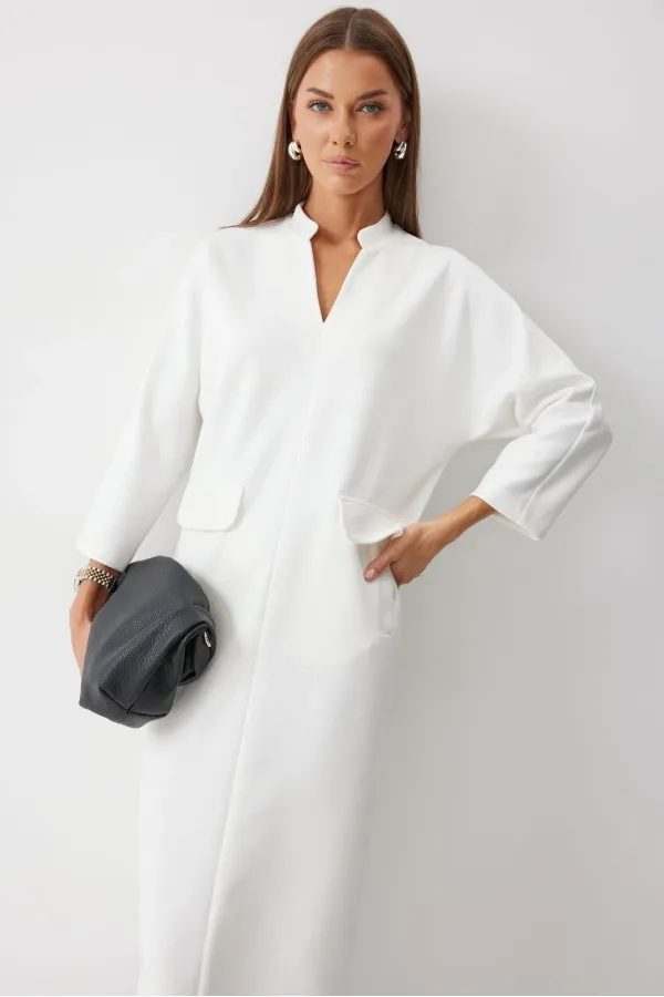 Платье прямого силуэта из трикотажного полотна длины миди. Рукав цельнокроеный, длиной ¾. Воротник-стойка. На передних половинках обработаны прорезные карманы с втачной листочкой и декоративным клапаном. По спинке расположен центральный шов с шлицей по низу.
