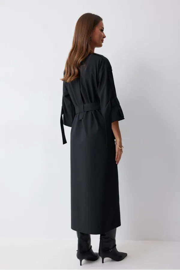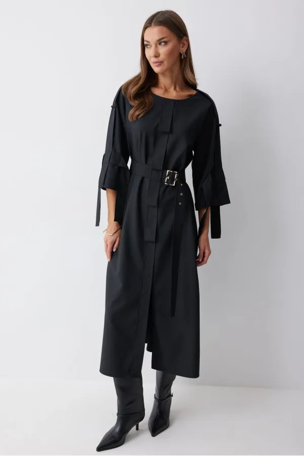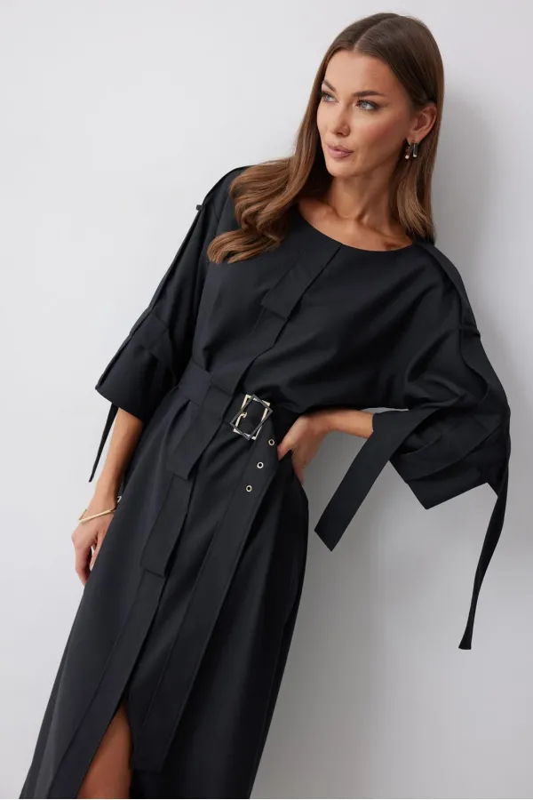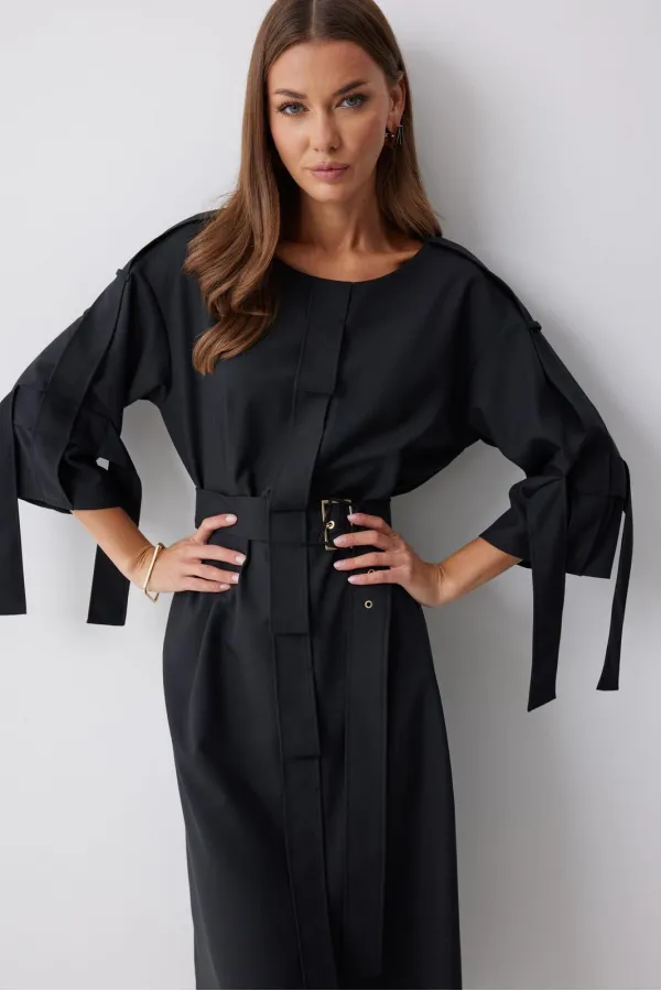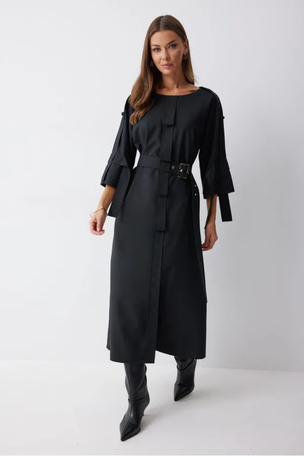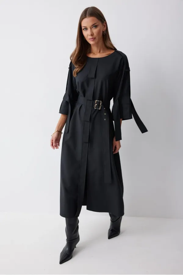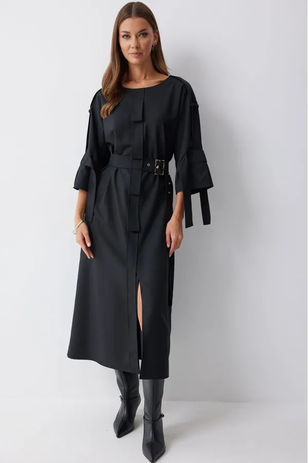 Платье прямого силуэта из костюмной ткани. Горловина округлая. Рукав со спущенной линией плеча длиной 7/8. По переду и спинке по центру декоративный элемент. В комплект входит съемный ремень. Обращаем ваше внимание, что фурнитура может отличаться от фото.