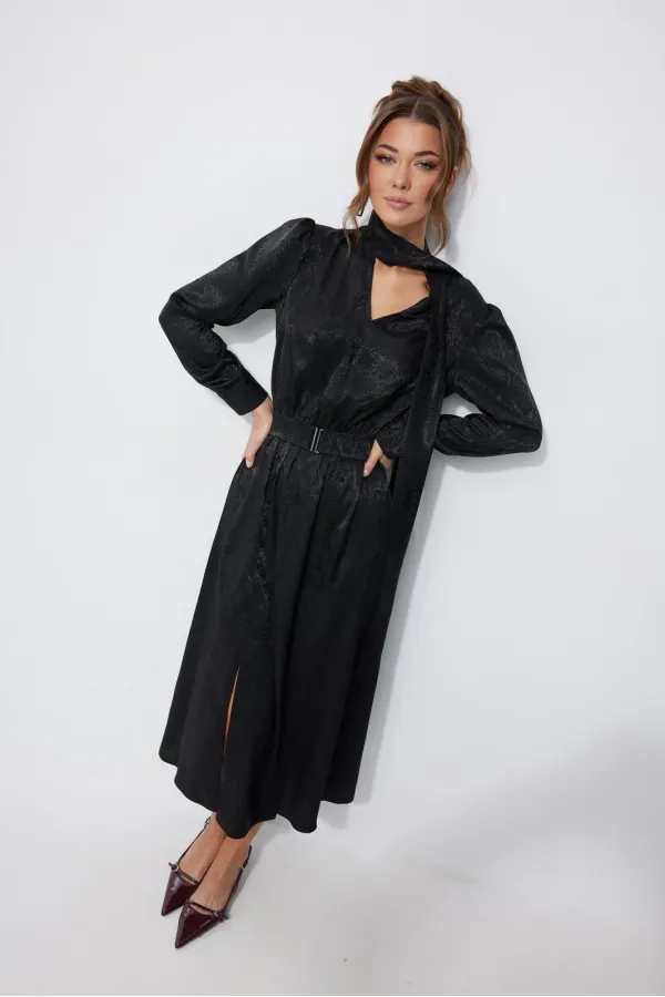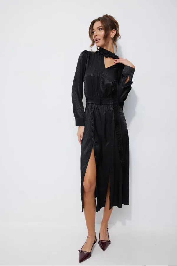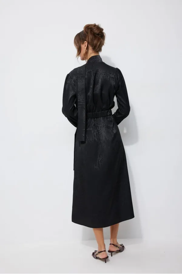 Нарядное платье из жаккардового атласа с анималистичным дизайном. Платье свободного кроя. Отрезное по талии, с резинкой. Рукав длинный, с манжетой с застежкой на петлю с пуговицей. Платье с мягким воротником-стойкой, переходящим в бант-завязки по переду. По переду V-образный вырез по горловине. По переднему полотнищу юбки шлицы в рельефах, рельефы от талии до шлиц декорированы пуговицами. Платье дополняется съемным поясом из основной ткани, с пряжкой. В среднюю часть пояса вставлена резинка. Обращаем Ваше внимание, что фурнитура может незначительно отличаться от фото.